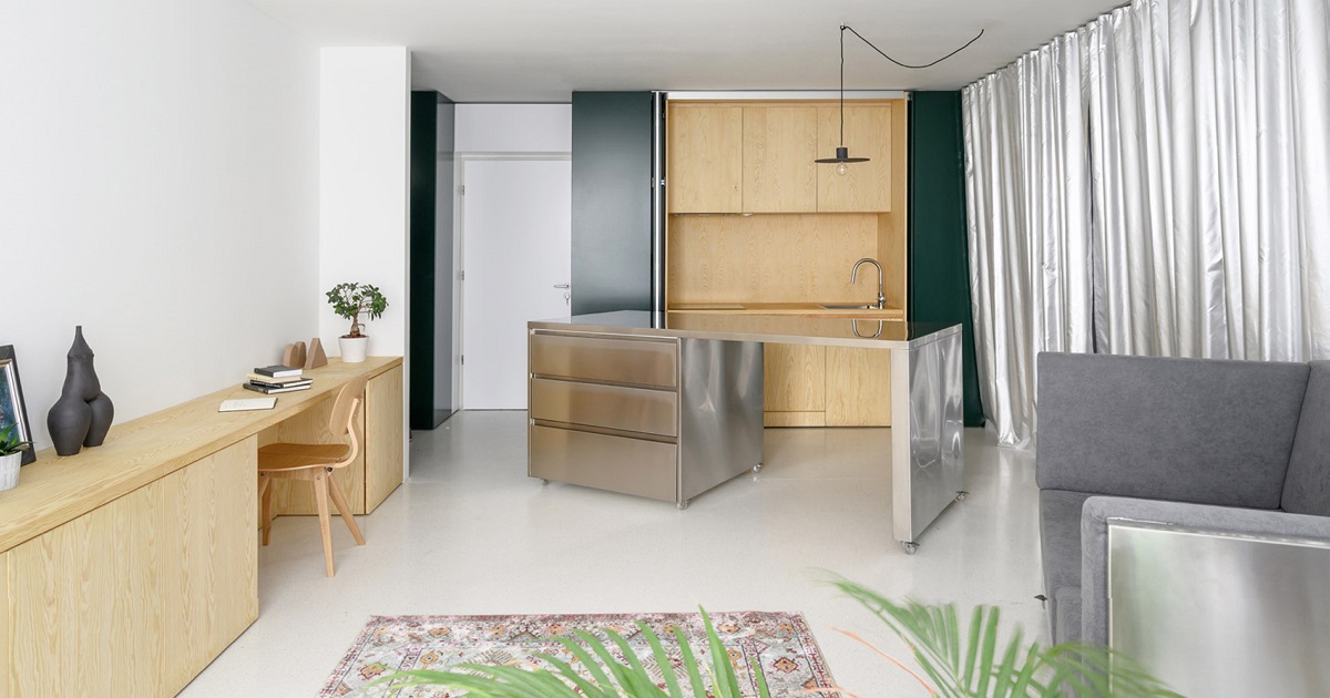 ეს ბინა სლოვენიის დედაქალაქ ლიუბლიანაში კომპანია Arhitektura d.o.o-ის არქიტექტორებმა მოაწყვეს. ინტერიერისთვის, ადაპტირებადი ავეჯი შეარჩიეს, რომ მეპატრონეებმა, საჭიროებისამებრ, სივრცის „გადაკეთება“ შეძლონ. აქ ხომ სამნი, ახალგაზრდა წყვილი და მათი ძაღლი ცხოვრობს. შესაბამისად, მნიშვნელოვანია ამ პატარა ფართის პრაქტიკულად გამოყენება.