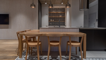 აქვეა მომცრო სამზარეულო და სასადილო ზონა, რომლებიც ყოველგვარი ტიხრის გარეშე, მხოლოდ ვიზუალურად არის გამოყოფილი დანარჩენი სივრცისგან. სწორედ ღია გეგმარების დამსახურებაა ის ფაქტი, რომ დიდი ვიტრაჟებიდან შემოსული ბუნებრივი განათება თანაბრად ნაწილდება ყველა ზონაში და მიუხედავად იმისა, რომ ბინას მხოლოდ ერთი განათების წყარო აქვს, ბინაში ეს არ იგრძნობა.