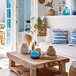 კლასიკური ყავისფერი ჩრდილების ნაცვლად, გამოიყენეთ ხისფერი აქცენტები. ხისფერი ყავისფრის უფრო ღია და ნეიტრალური ელფერია და სივრცეს ელეგანტურობასა და დახვეწილობას მატებს, თავად ლურჯს კი საშუალებას აძლევს, გამოირჩეოდეს მისთვის დამახასიათებელი სიმძიმისა და სიმკვეთრის გარეშე.