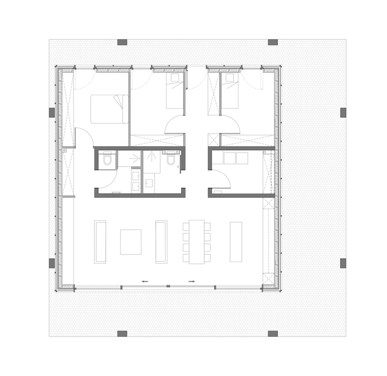 სახლის ფორმა ერთგვარად პასუხობს სასოფლო სამეურნეო დაბლობის ჰორიზონტალურობას. სახურავი ქმნის კვადრატს, რომლის ზომაცაა 15 მ x 15 მ, ხოლო საცხოვრებელი კი – 12 მ x 12 მ. ბინის ნაწილი გარშემორტყმულია არაკონსტრუქციული ხის ჩარჩოს კედლებით, რომელიც მოიცავს ბიომომარაგების მატყლს და ხის ბოჭკოს იზოლაციას.