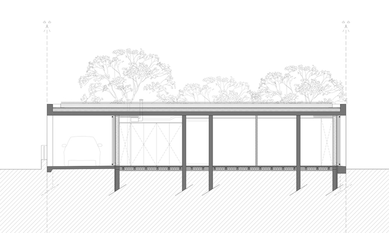 ქუჩის მხარეს, დახურული ფასადით დაფარულ ოთახებს აქვთ მაღალი ფანჯრები, რაც ოთახს მაგიურ სიკაშკაშეს ანიჭებს, ფანჯრები კი, თავის მხრივ, ბუნებრივად აერთიანებენ ფასადის ჩარჩოებს. ბაღის მხრიდან, სამზარეულო უკავშირდება მისაღებ ოთახს. მსგავსი მოწყობით მყარდება მჭიდრო ურთიერთობა ბაღთან. ეს უწყვეტობა ინტერიერს და ექსტერიერს შორის კულმინაციას აღწევს ორი ფანჯრის გახსნით, რაც ქმნის თავისუფალ გასასვლელს ბარიერისა და ძელის გარეშე.