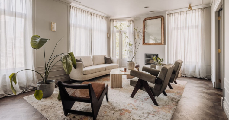 კომფორტული მისაღები ოთახი ქალაქური სახლის მეორე სართულზე მდებარეობს. ოთახი შეღებილია ღია ნაცრისფერ ელფერში და ნეიტრალური ტონების მქონე ულამაზესი ნივთებით არის გაფორმებული.
