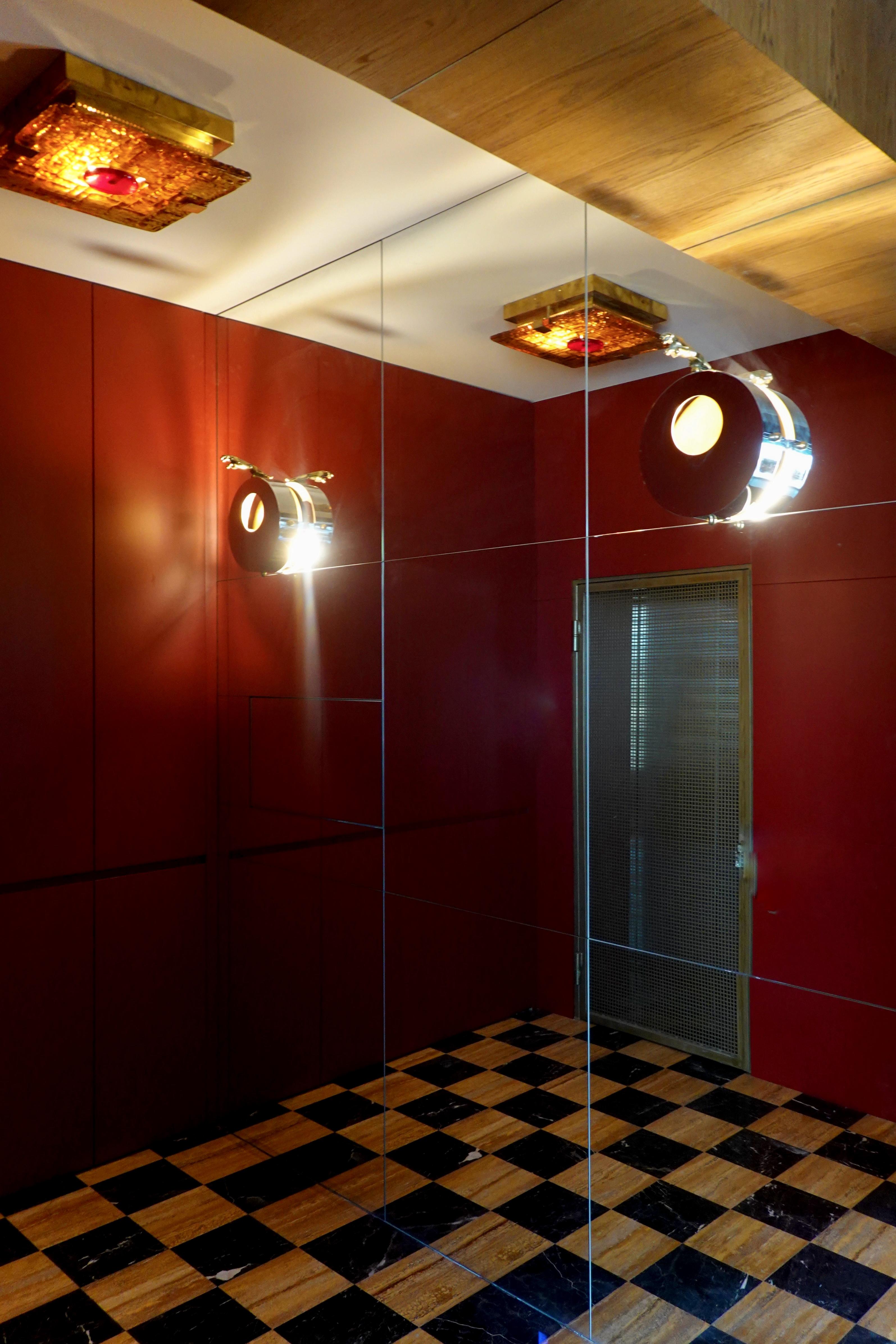 შესასვლელი სივრცე თეატრალურ ატმოსფეროს ქმნის: სარკისებური კედლები უსასრულობის ეფექტს იძლევა, ღრმა წითელი ტონი ინტენსიურობას მატებს გარემოს, ხოლო ჭადრაკისებური მარმარილოს იატაკი მკაფიო რიტმს ამყარებს. განათება აქ სცენური ხასიათისაა და სივრცეს დრამატულ ელფერს სძენს.