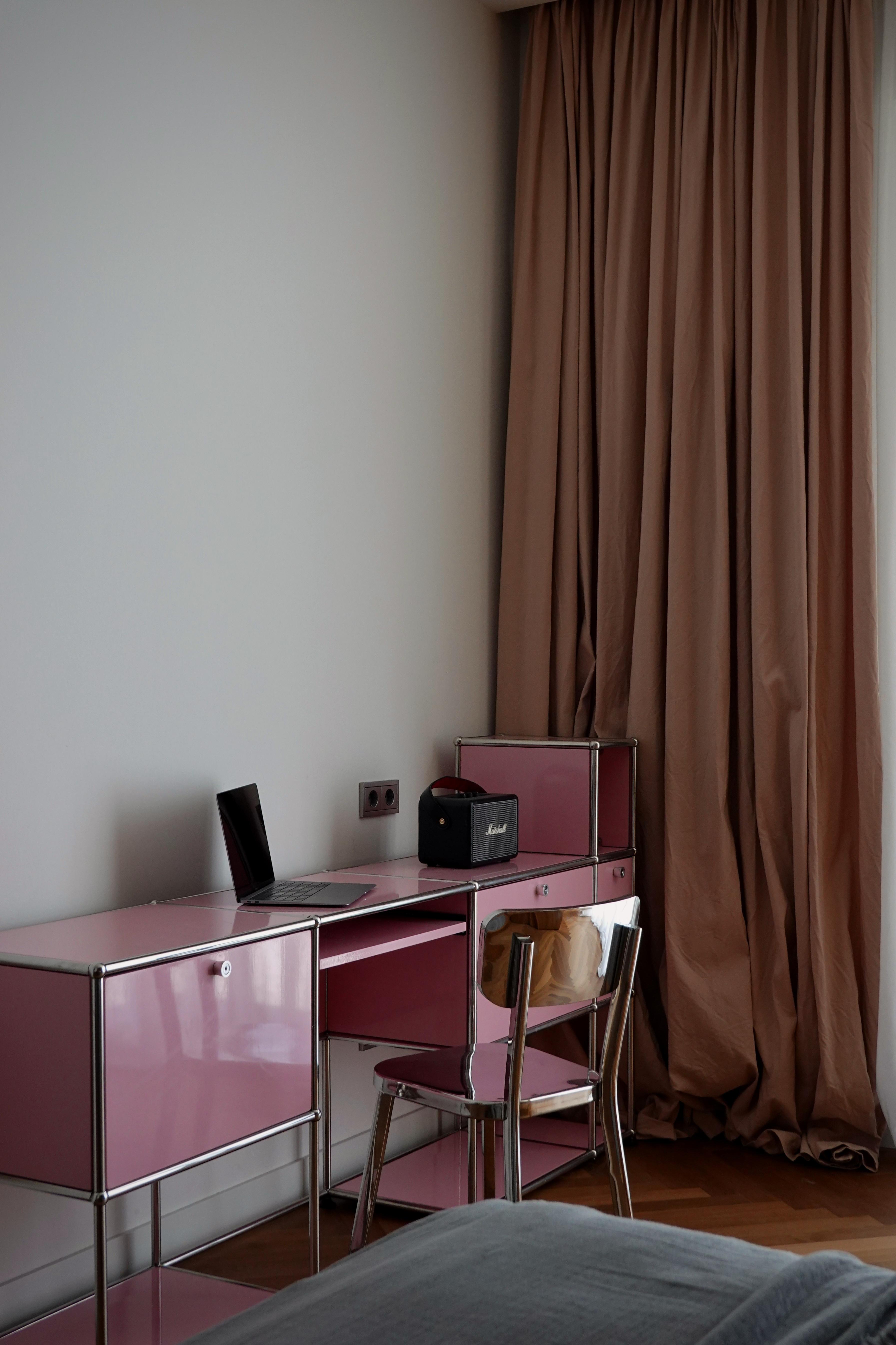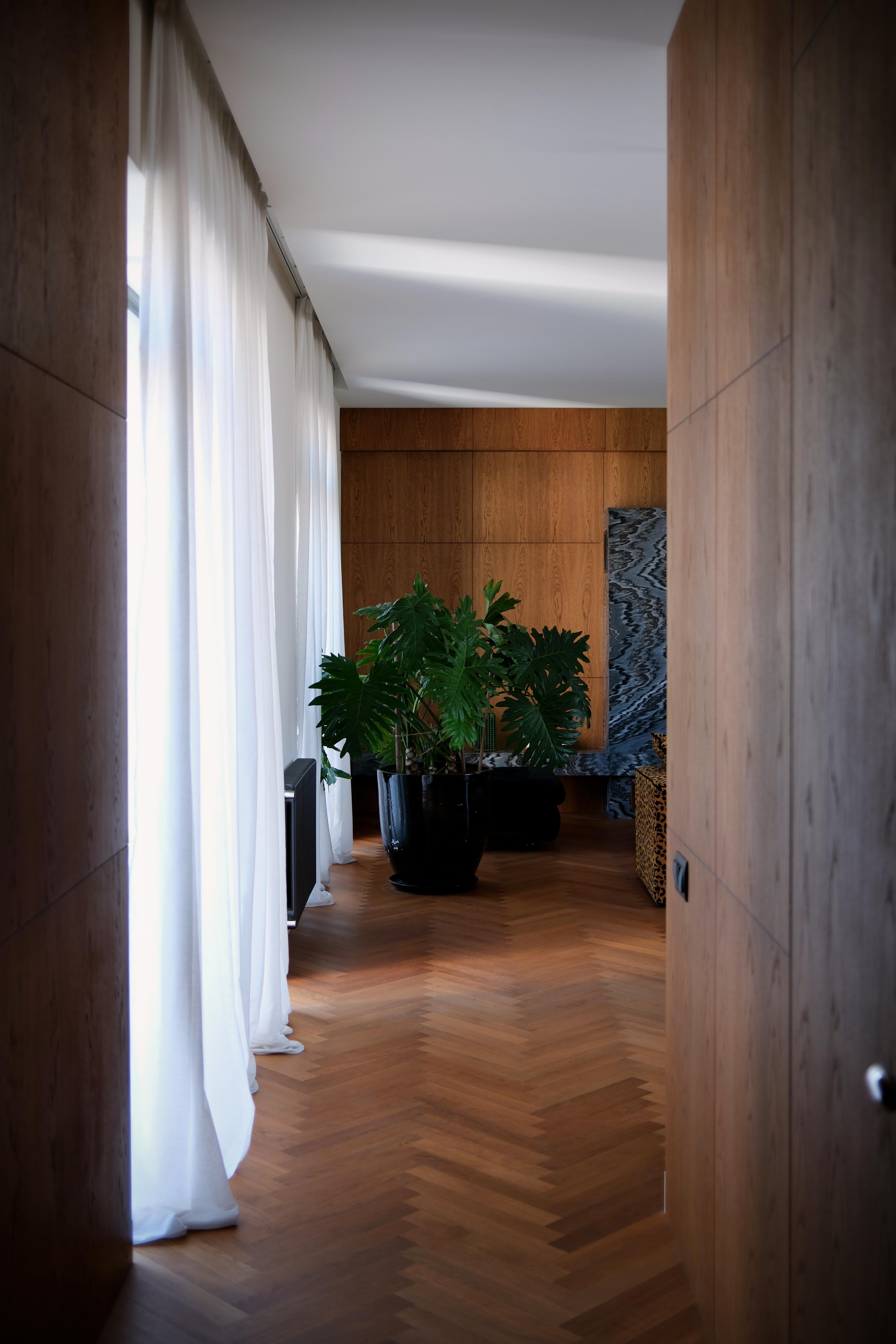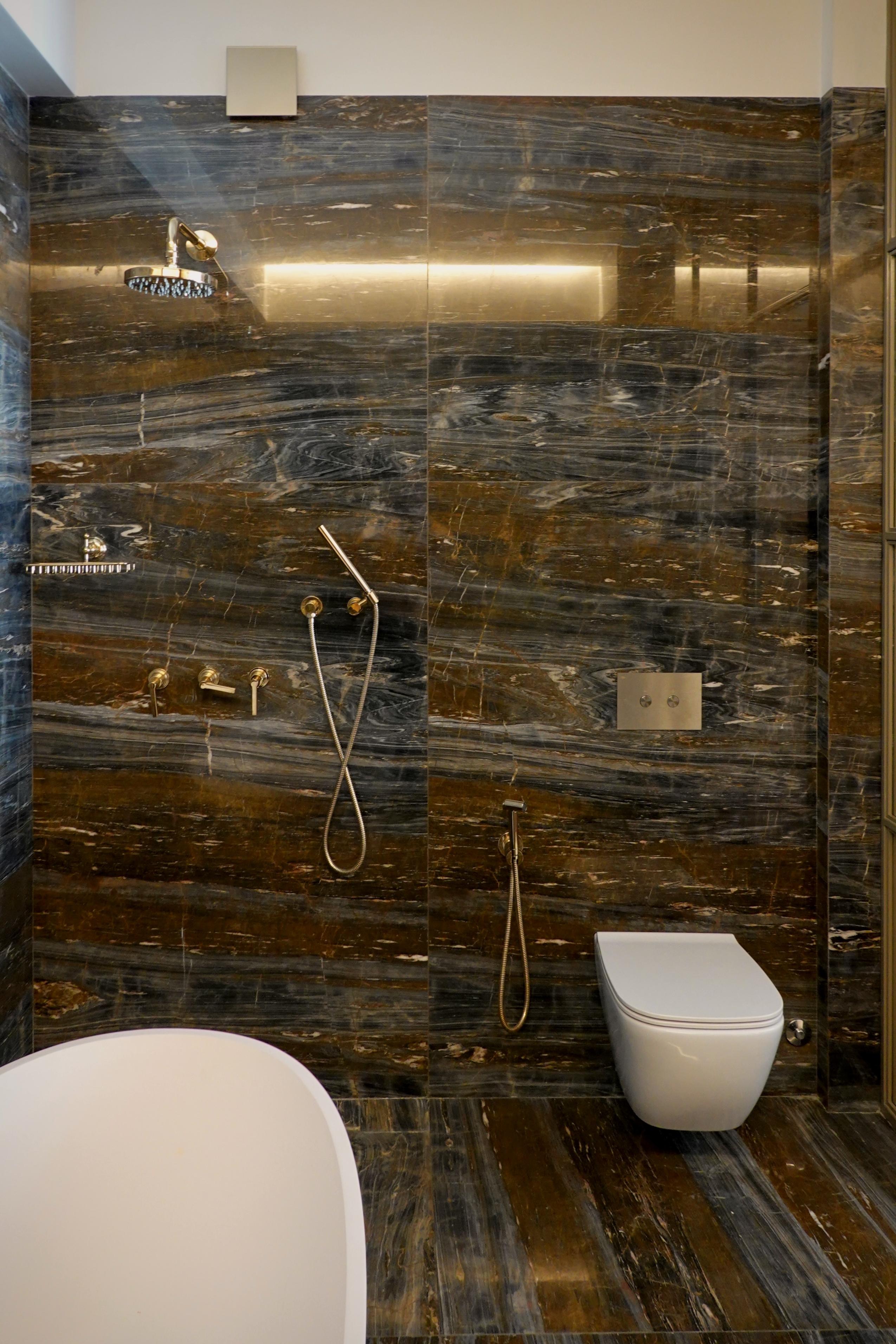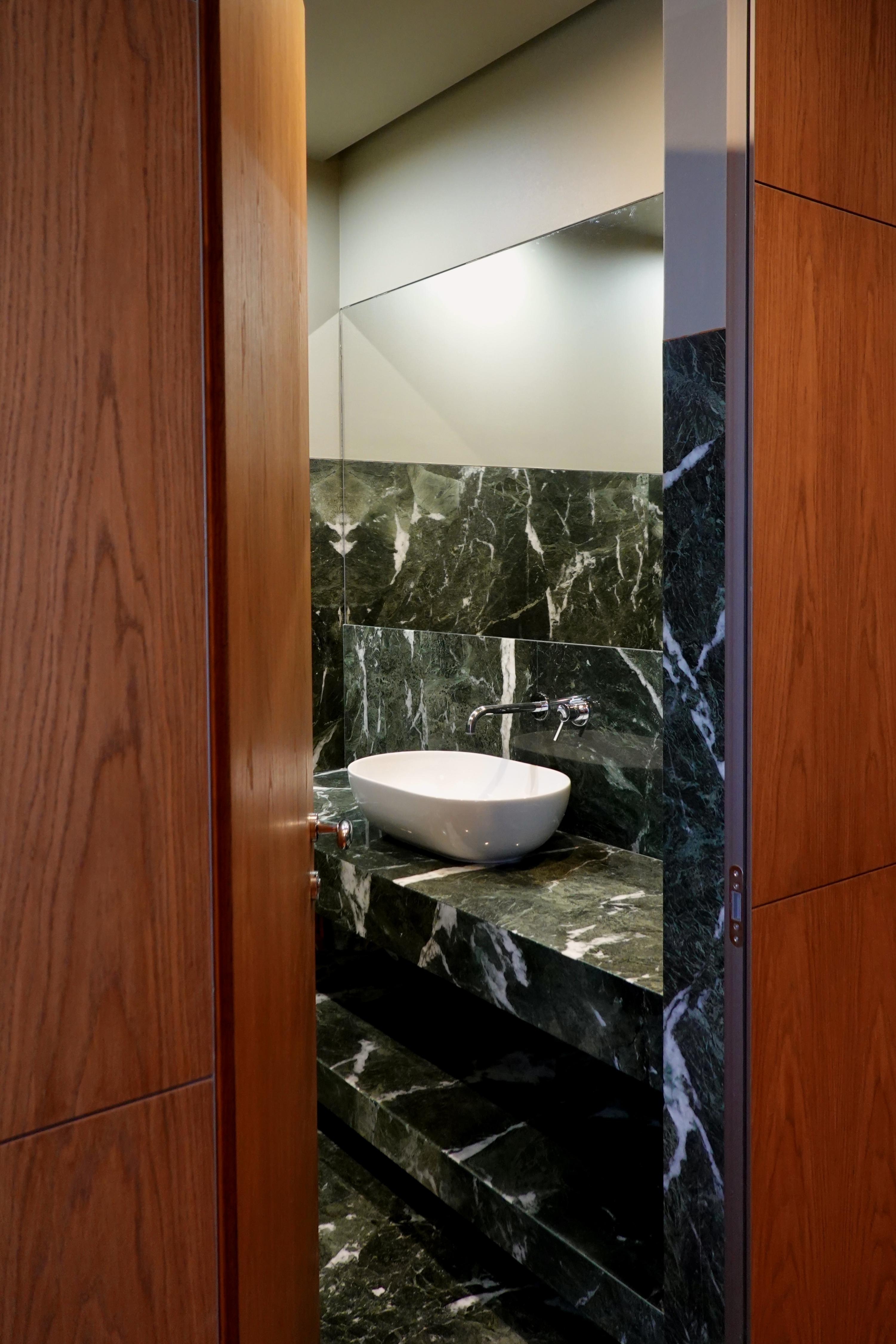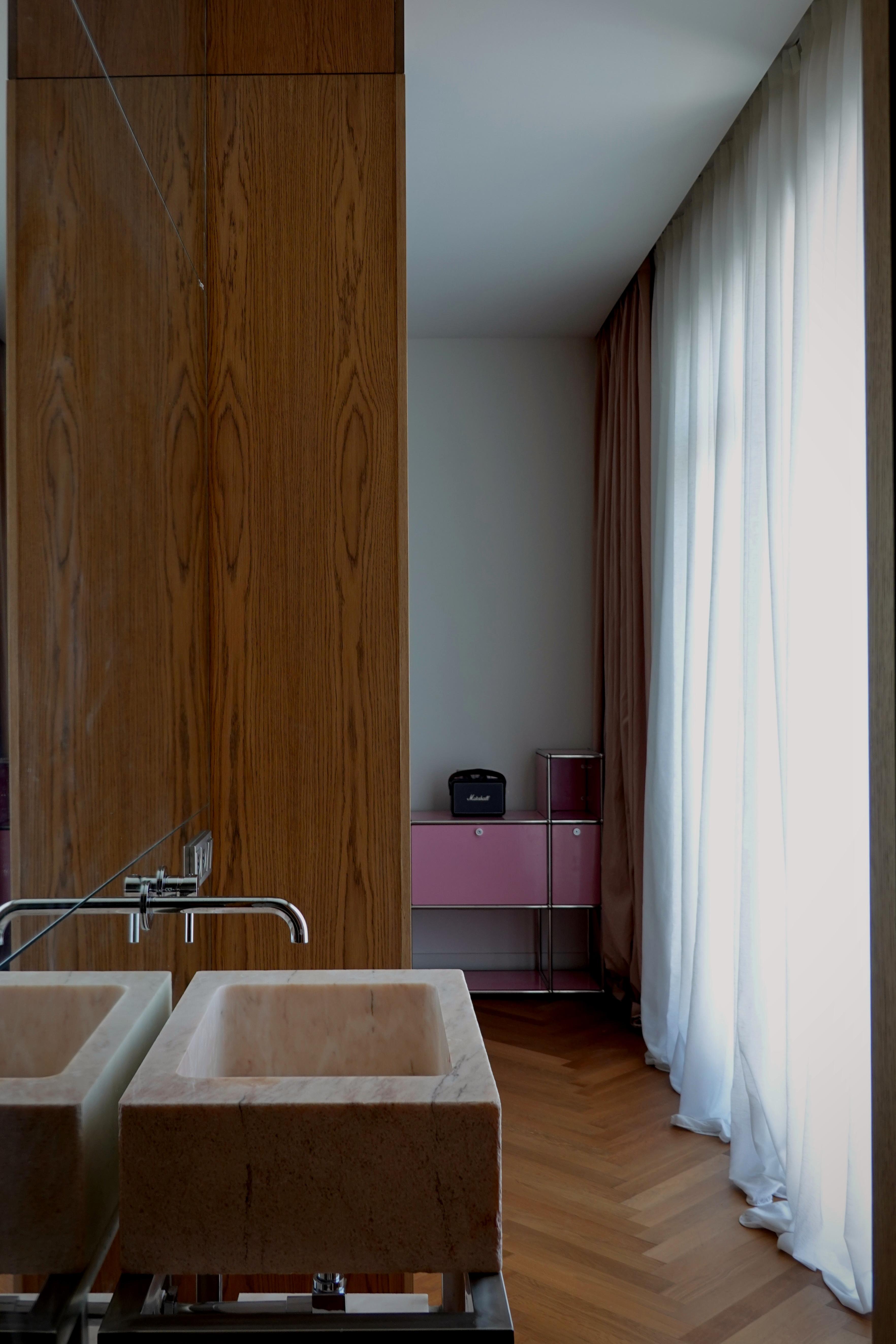 სტუმრების აბაზანაში მწვანე მარმარილოთი მოპირკეთებული კომპაქტური სივრცე გვხვდება.  ხოლო საბავშვო ოთახში ინტერიერი მინიმალისტური და თანამედროვე სტილისაა, სადაც თბილი ხის პანელები ქმნის სივრცის მთავარ ფონს, ხოლო ჩაშენებული საწოლი და თაროები ფუნქციურობასა და სისუფთავეს უსვამს ხაზს. აბაზანის ქვის ნიჟარა მეტალის კონსტრუქციით ინდუსტრიულ შტრიხს მატებს სივრცეს, ხოლო ვარდისფერი მეტალის მაგიდა საინტერესო კონტრასტს სძენს ოთახს, შედეგად კი ინტერიერი იქცევა ერთიან, ჰარმონიულ კომპოზიციად, რომელიც ბუნებრივ სითბოსა და ექსპერიმენტულ თანამედროვე აქცენტებს აერთიანებს.