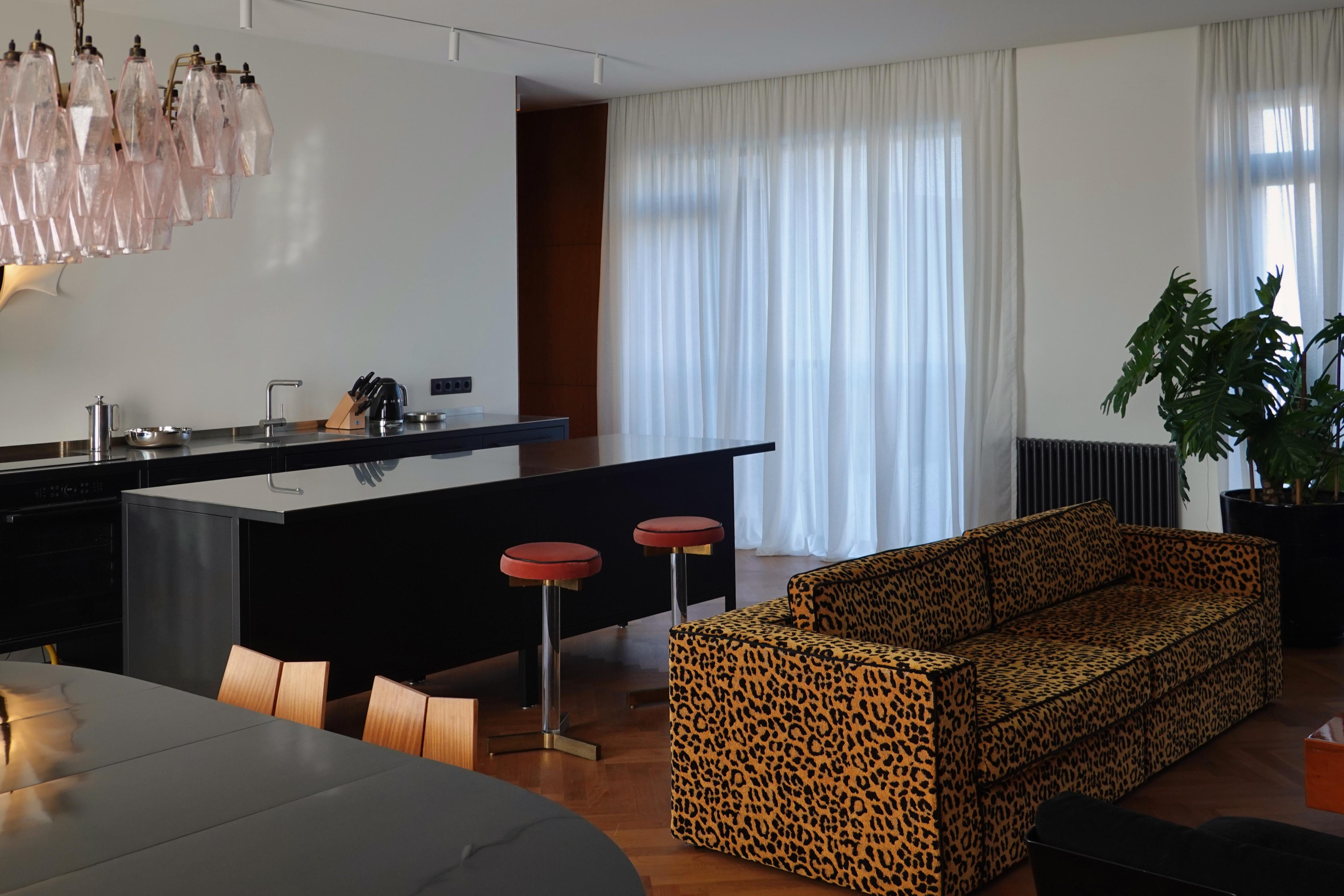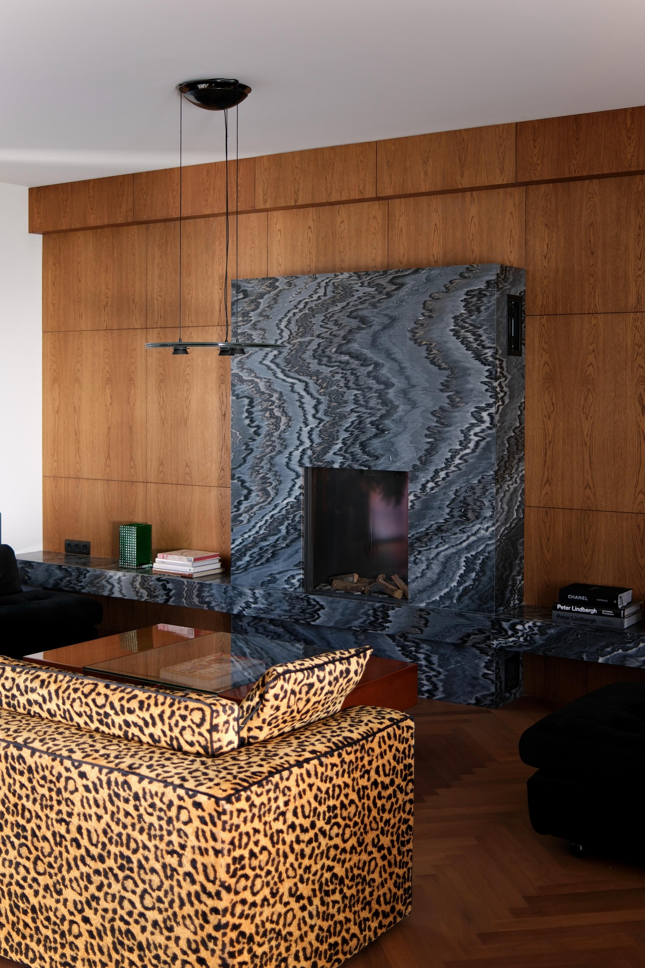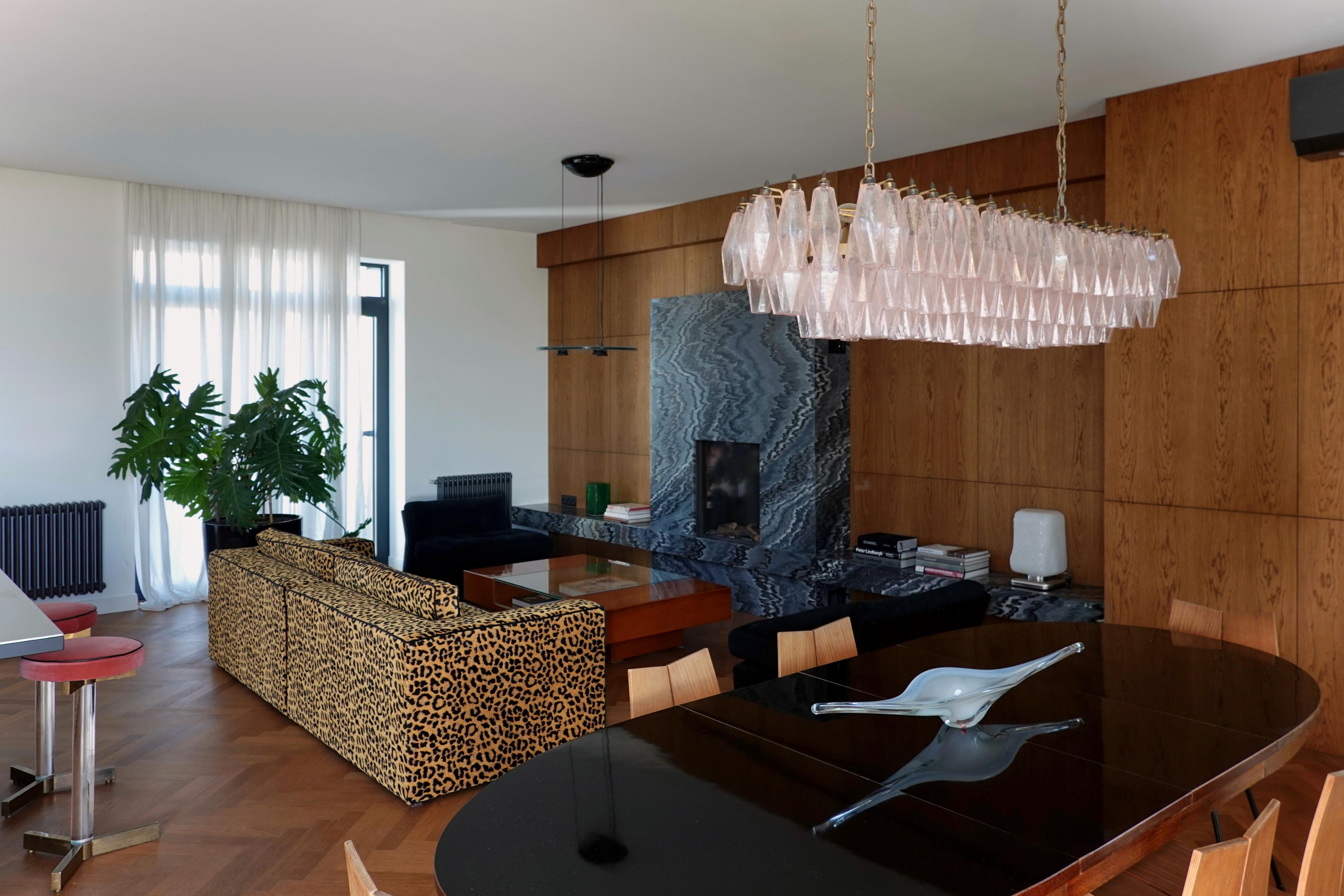 მისაღებში მუხის მასალით მოპირკეთებული კედლები თბილ ფონს ქმნის, რომლის ცენტრშიც უმშვენიერესი მონუმენტური მარმარილოს ბუხარია. ლეოპარდის პრინტით გაწყობილი დივანი ირონიულ სითამამეს მატებს სივრცეს, ვენეციური შუშის ვარდისფერი ჭაღი კი სასადილო ზონას სინათლით ავსებს.