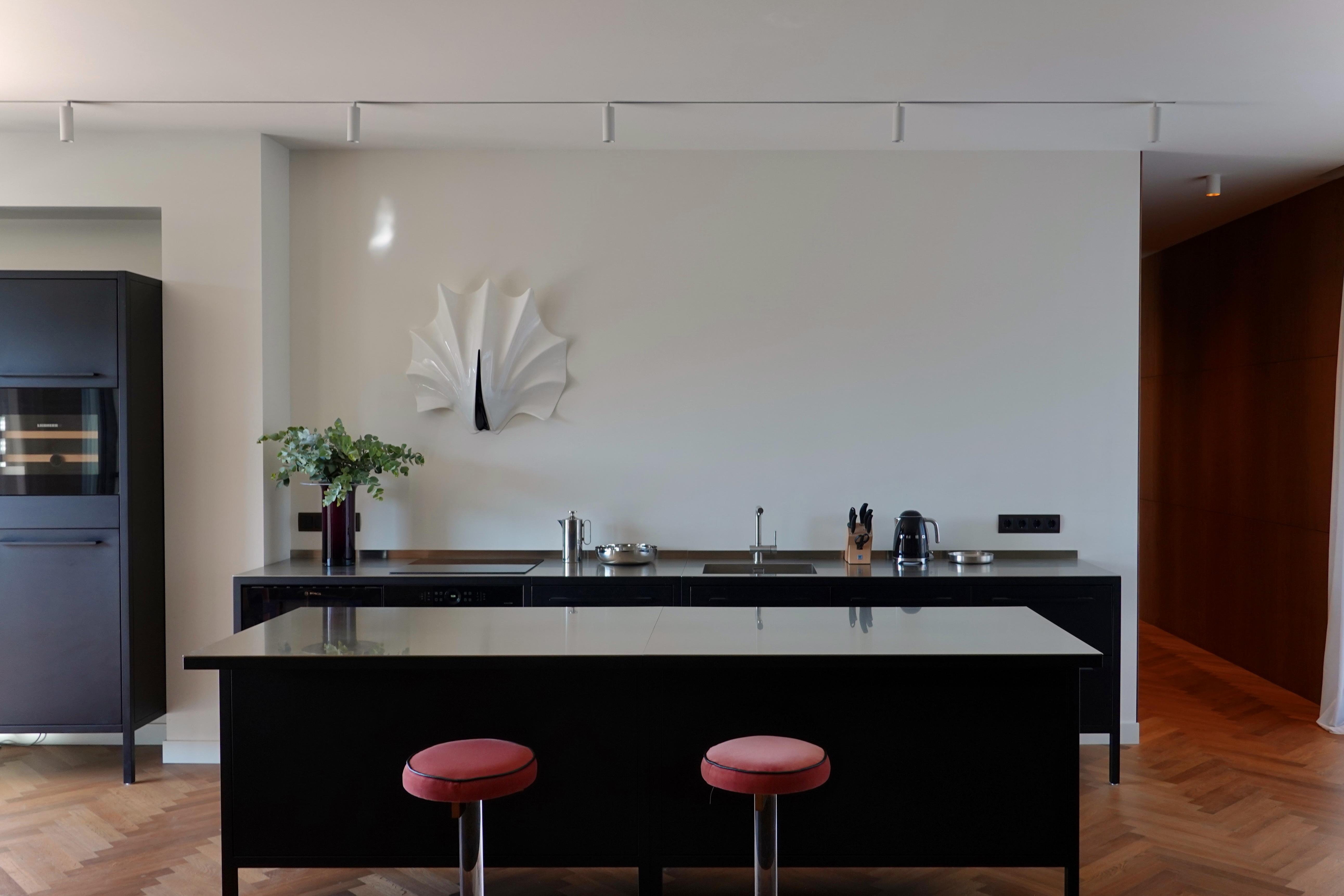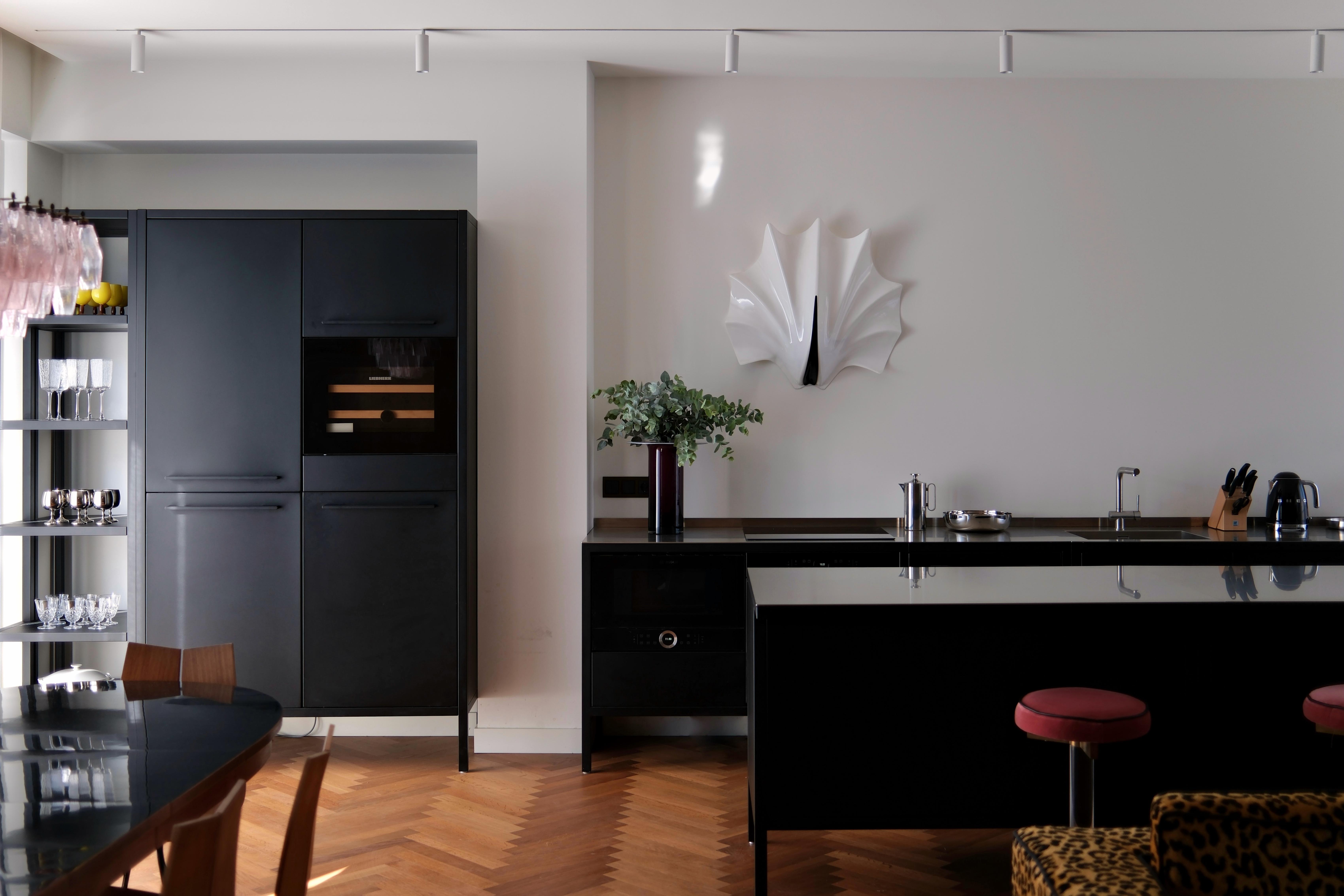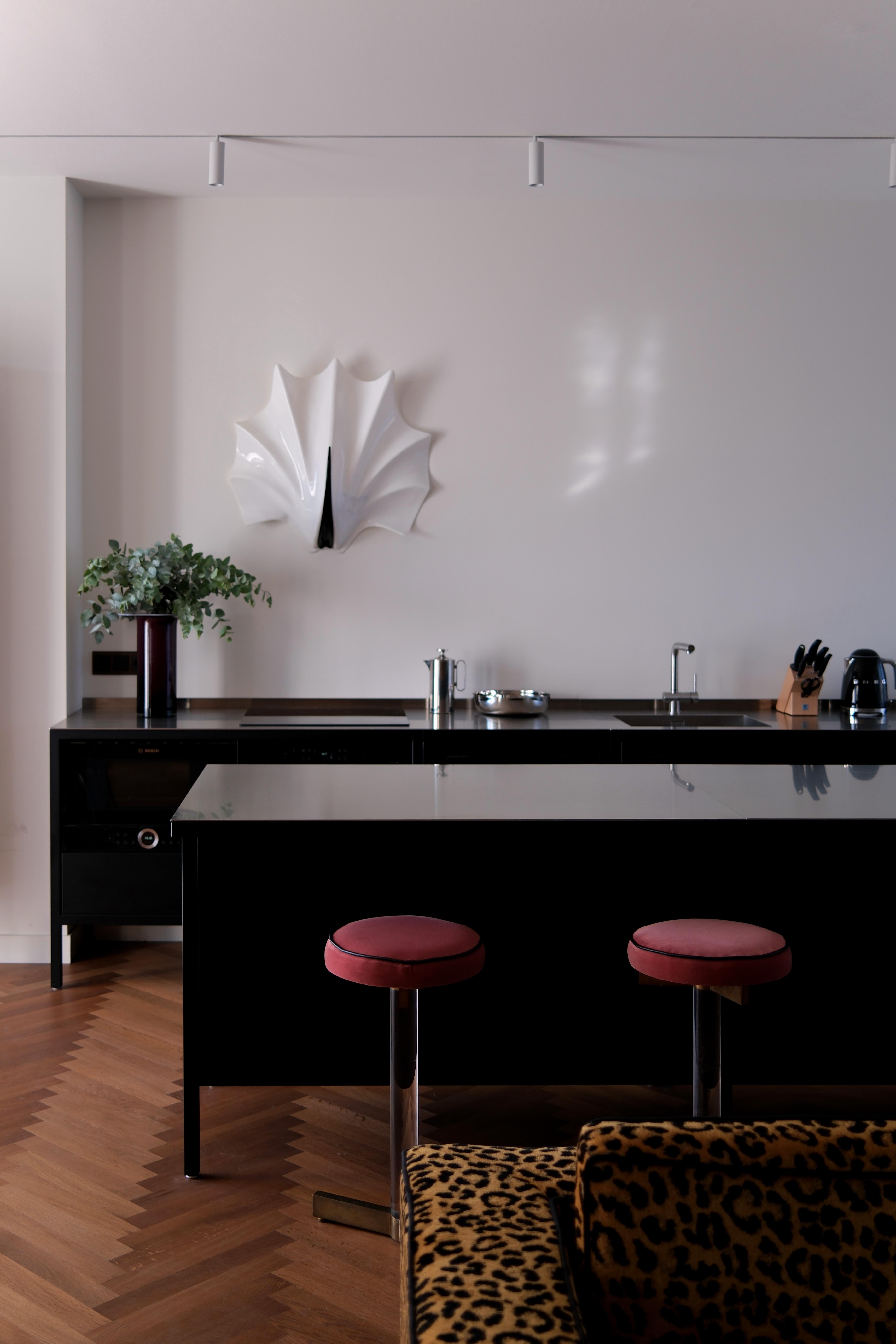 სამზარეულო შავი მინიმალიზმის მაგალითია. წითელი სკამები კუნძულთან და ღია თაროებზე გამოფენილი ჭურჭელი სივრცეს ცოცხალ ელფერს სძენს.