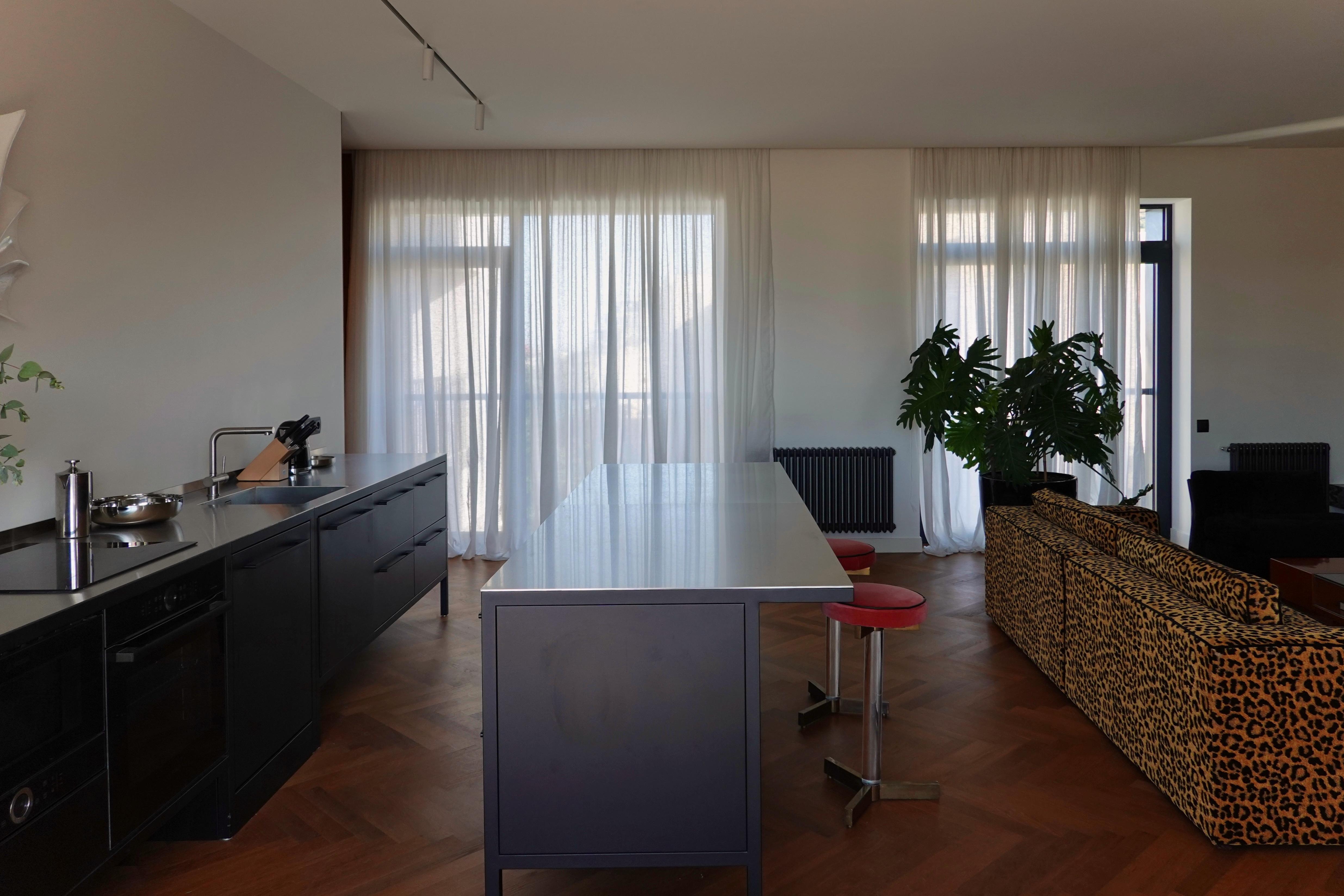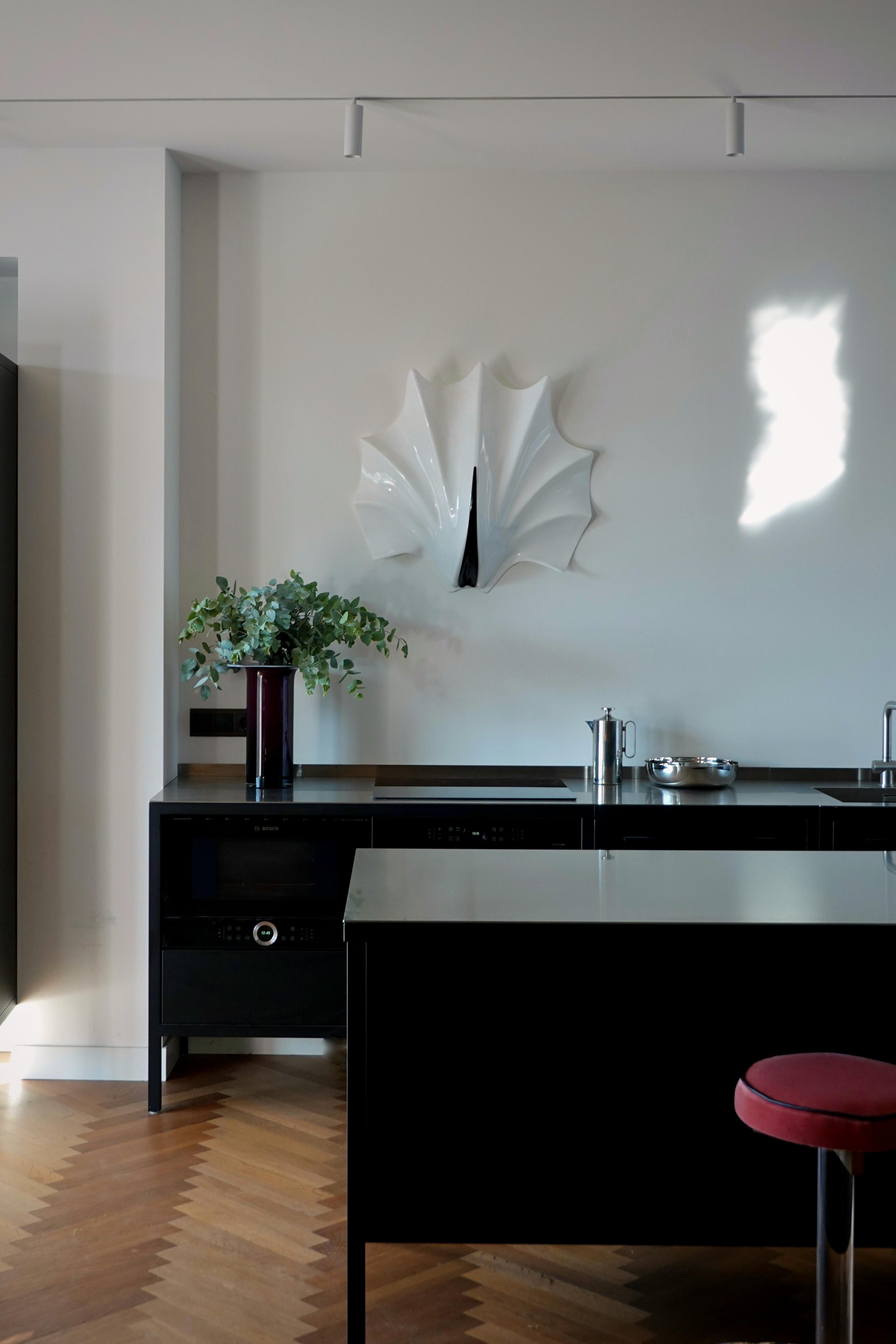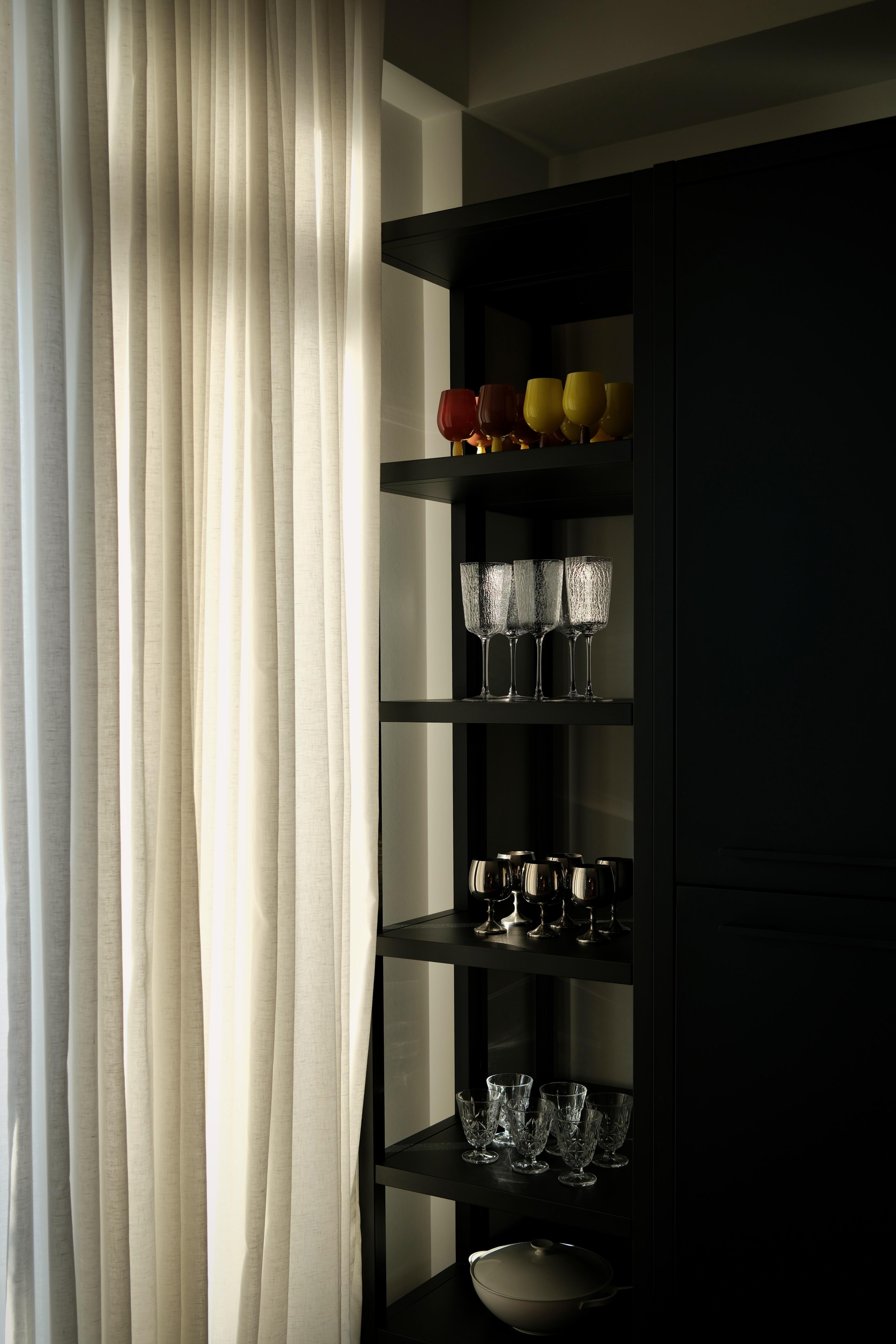 სამზარეულო შავი მინიმალიზმის მაგალითია. წითელი სკამები კუნძულთან და ღია თაროებზე გამოფენილი ჭურჭელი სივრცეს ცოცხალ ელფერს სძენს.