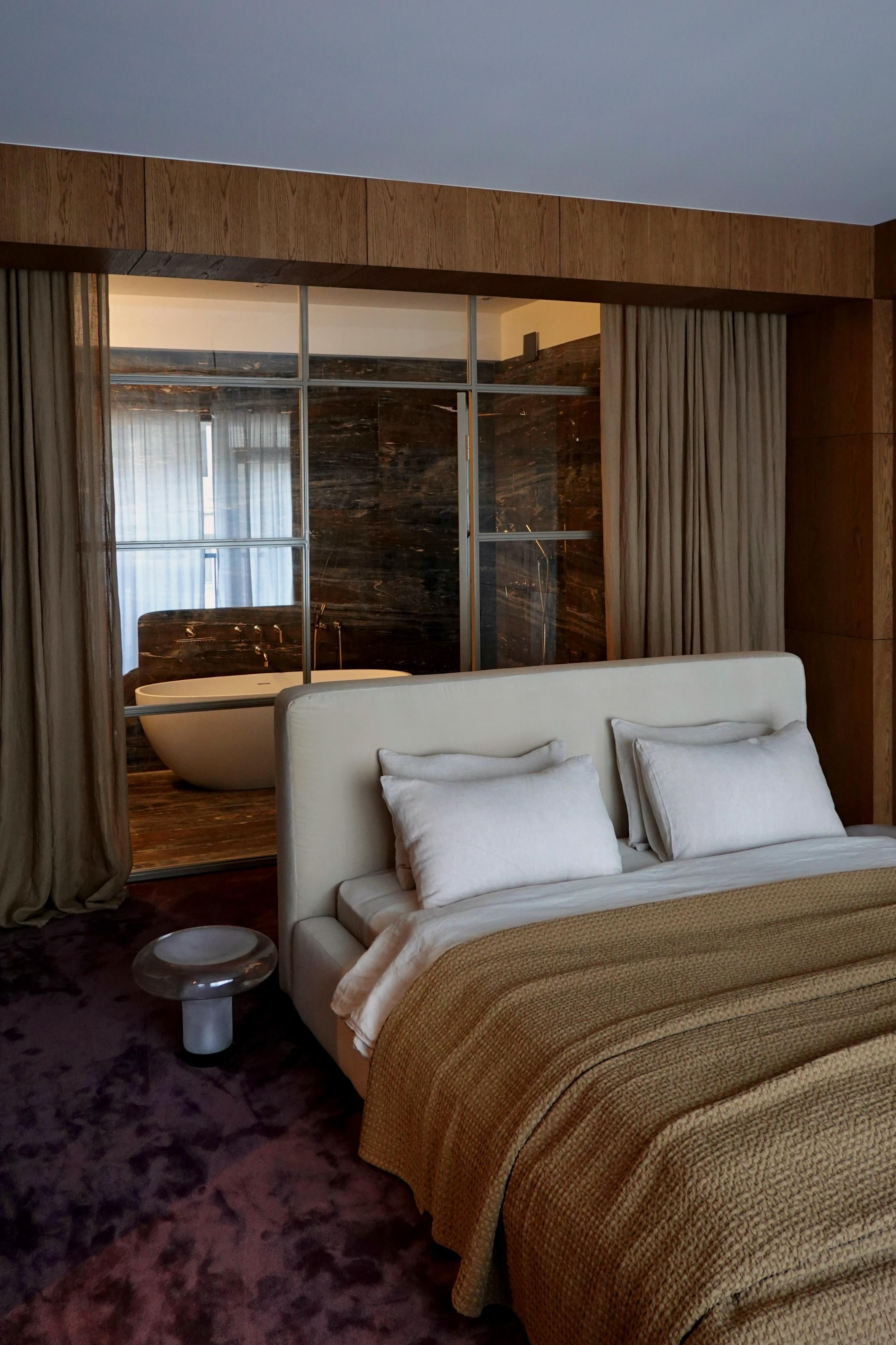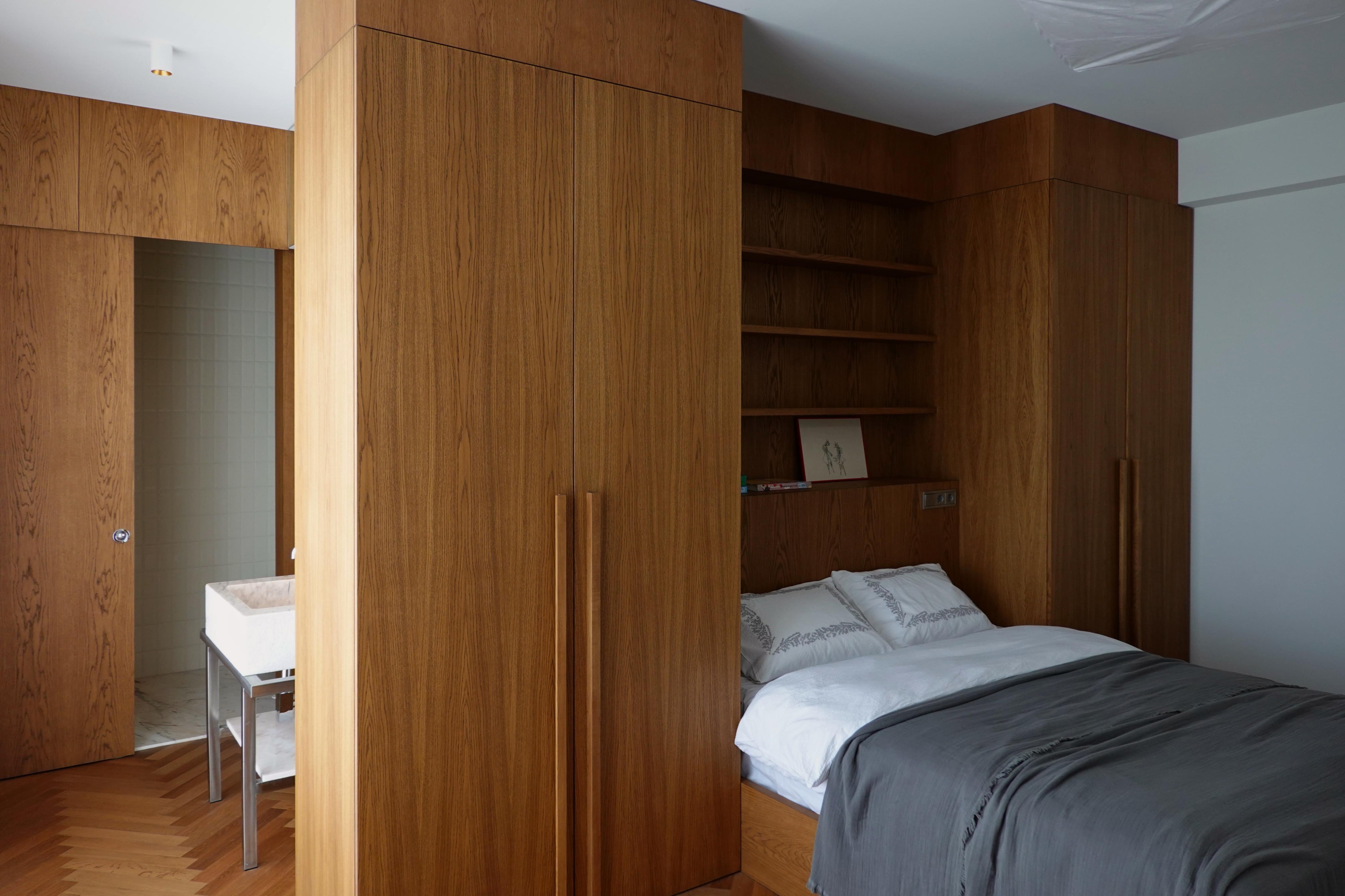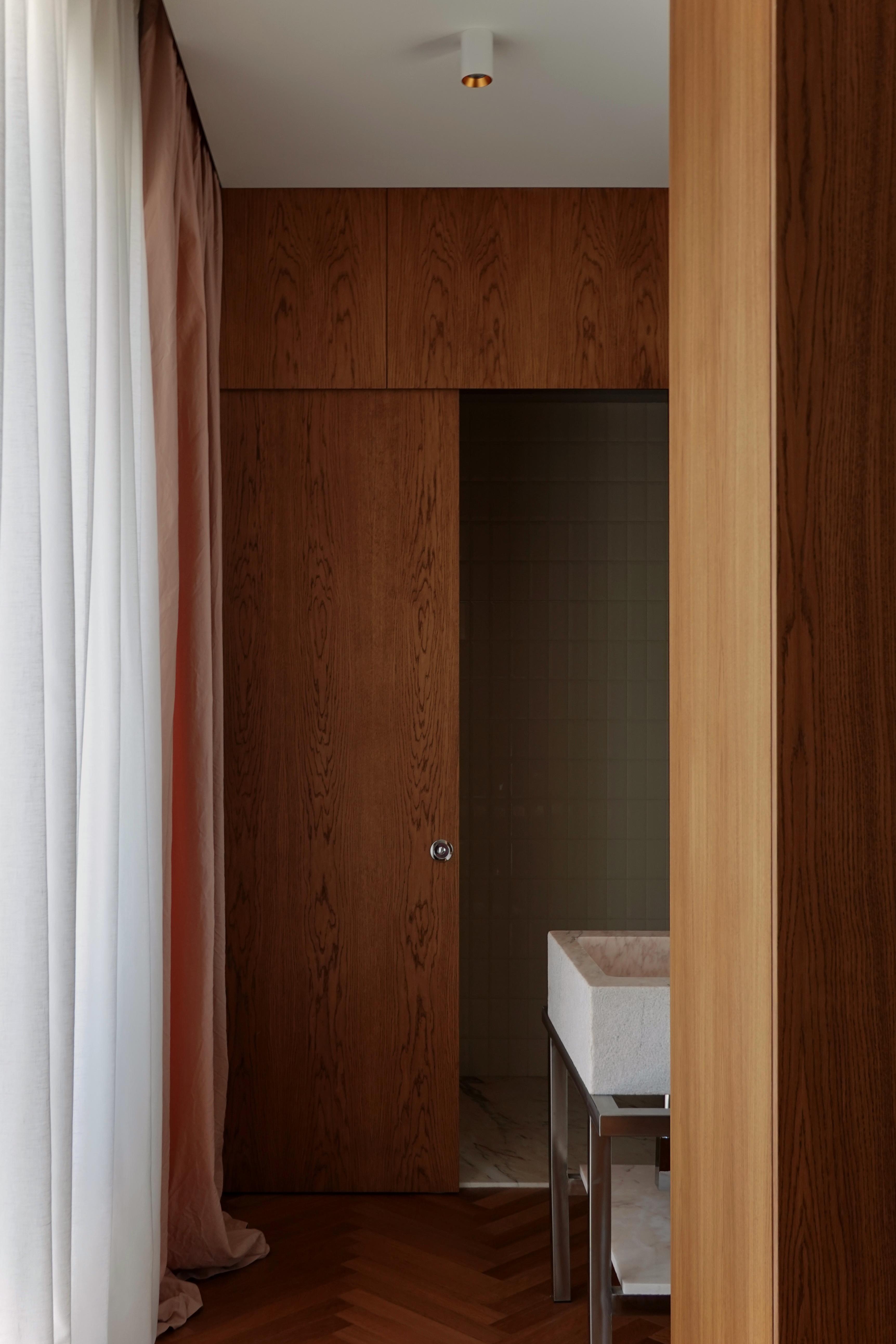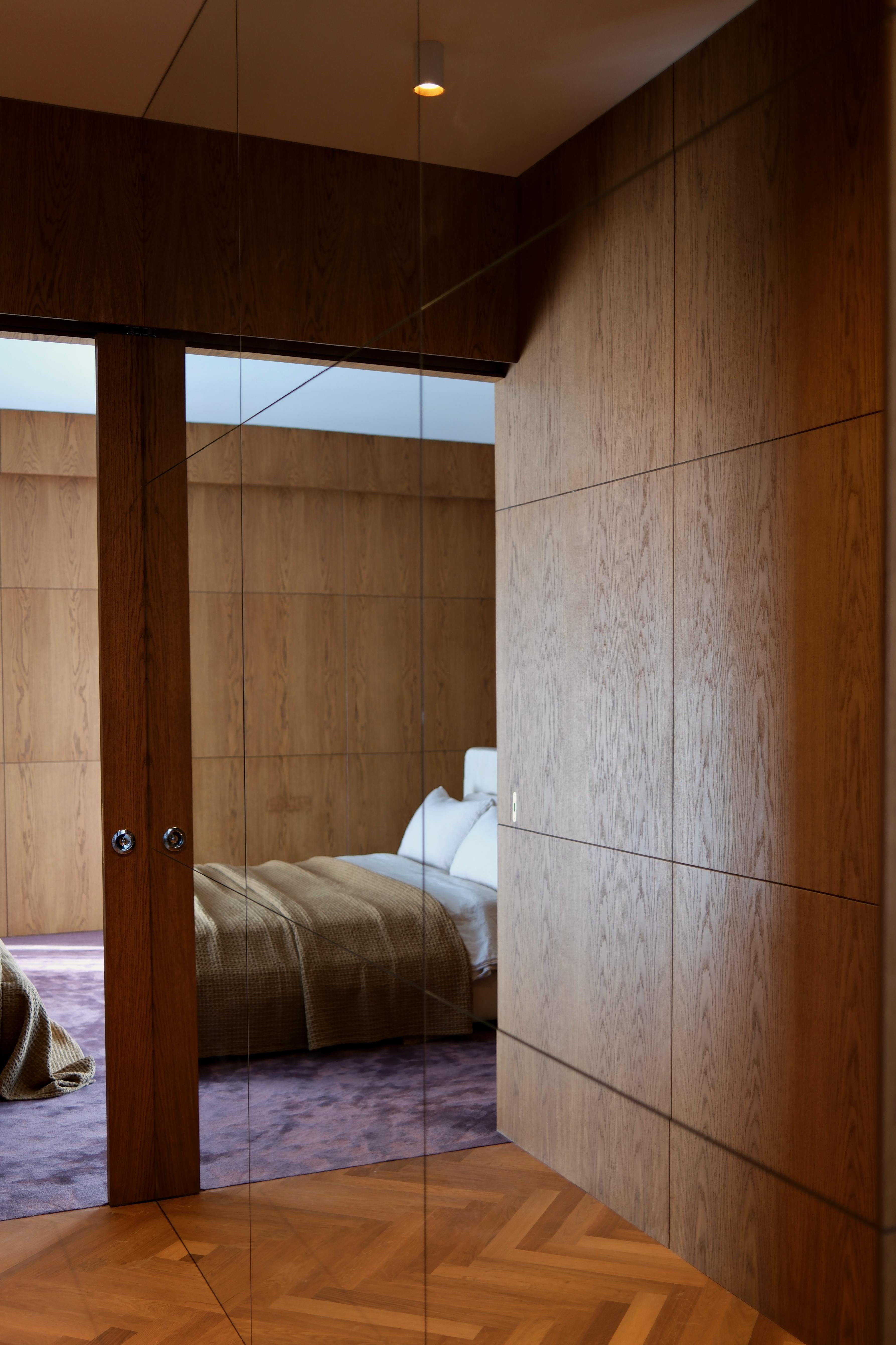 საძინებლებში გვხვდება მუხის პანელირები და ბუნებრივი ქსოვილები, რაც თბილ ატმოსფეროს ქმნის. მთავარი საძინებელი მინის ტიხრით უკავშირდება სველ წერტილს, სადაც ბრინჯაოს დეტალები და მდიდარი ტექსტურები ფიგურირებს, ხოლო ცენტრალურ ელემენტად თავისუფლად მდგომი აბაზანა გვევლინება.