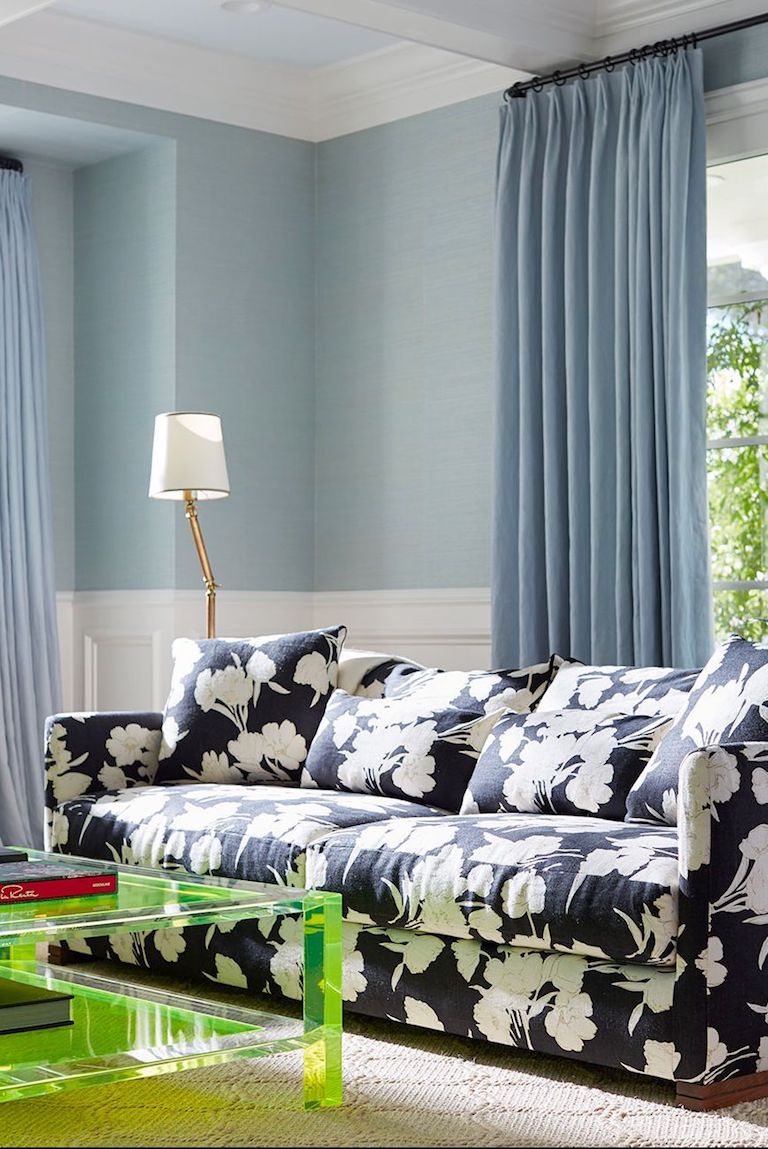 ამ ოთახში ერთი შეხედვით ყველაფერი ნეიტრალურია – ფარდები, კედლები საკმაოდ კლასიკურ შეგრძნებას ტოვებენ. თუმცა, დიზაინერმა ისურვა, ეს ინტერიერი ყვავილოვანი დივანით გაეხალისებინა და მასთანვე დაედგა მწვანე, გამჭვირვალე მაგიდა. თუკი მისაღები ოთახის გახალისება გსურთ, მშვენიერი ხერხია მასში ამგვარი “მოულოდნელი” ეფექტი შეიტანოთ.