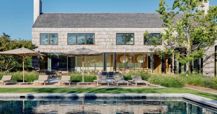 დენ სკოტიმ, რომელსაც ოჯახთან აქამდეც უმუშავია, არქიტექტორი – რაიმონდ რენო მოიწვია და მათ ერთად არაჩვეულებრივი თავშესაფარი შექმნეს. (სიმსმა სთხოვა მეგობარს, მიმი ბრაუნს, ინტერიერის დიზაინში დახმარება, ხოლო AD100-ის დიზაინერს – ბრიჟეტ რომანეკს სველი წერტილების დეკორაცია გადააბარა). საცხოვრებელი მრავალი ნაგებობისგან შედგება – დასავლეთით არის სტუმართათვის განკუთვნილი ორი საძინებლის მქონე ფრთა „ასე რომ, მთელ ოჯახს შეუძლია განმარტოვდეს ყველასგან მოშორებით“ – ამბობს სიმსი. ცენტრში არის დიდი ოთახი, რომელსაც სიმსი ბარს უწოდებს, თუმცა ეს უფრო სასტუმრო ოთახია ბარით. და ბოლოს, არეალი, რომელიც L- ფორმას ქმნის არის ის მონაკვეთი, სადაც ოჯახის ძირითადი საცხოვრებელი ფართებია განთავსებული.