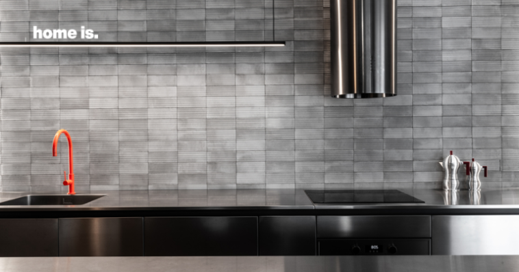 საინტერესოა ისიც, რომ სამზარეულოს კედელი კომპანია “MARAZZI”-ის “Rices”-ის კოლექციიდან წარმოდგენილი მოცულობითი ფორმის სერი ფერის ფილებითაა მოპირკეთებული, რაც ოთახის ერთიანობას უსვამს ხაზს და ინტენსიურ ვერცხლისფერს ერთგვარად აბალანსებს. “Tom Dixon”-ის ქრომირებული მრგვალი დისკოს ბურთის მქონე განათებას კი ამაღლებული და სასიამოვნო განწყობა შემოაქვს. აქცენტის შესაქმნელად დიდ როლს ასრულებს  კომპანია “TRESS”-ის ძალიან ორიგინალური, კონტრასტული, ნარინჯისფერი შემრევიც.