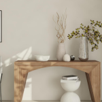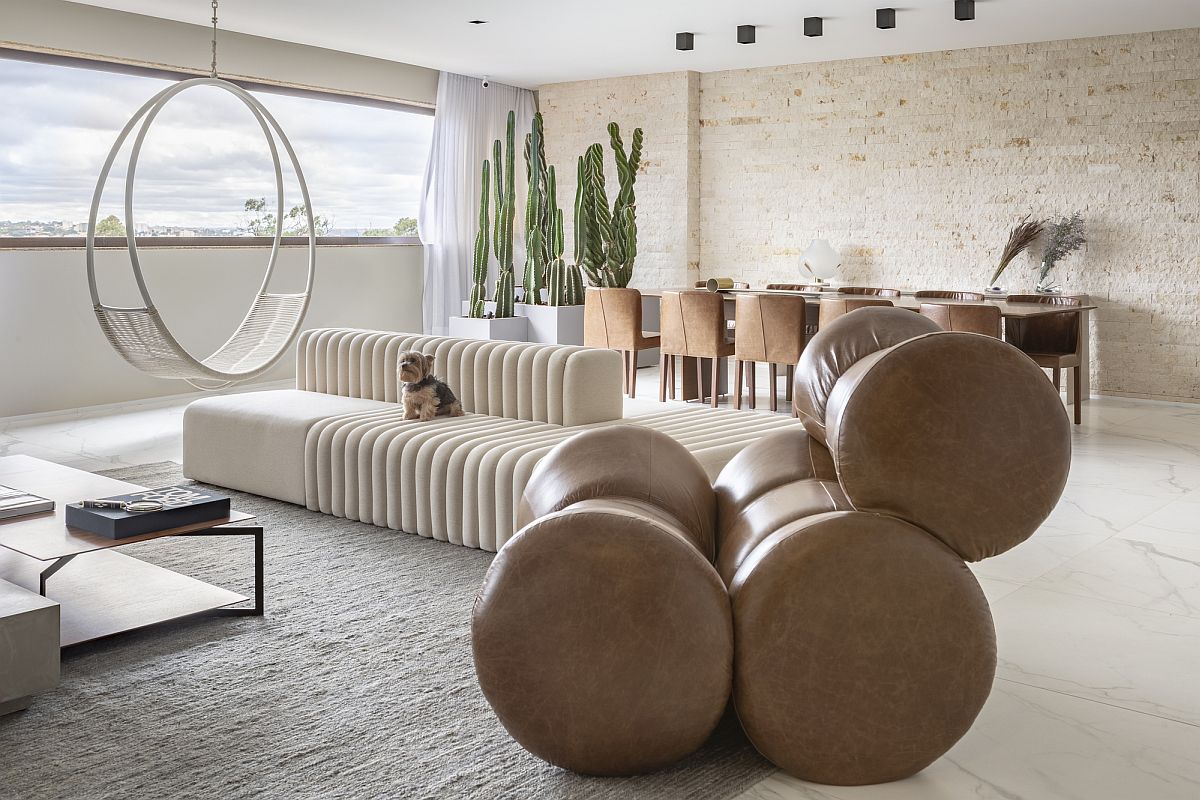 მუქი ნაცრისფერი კედლებისგან განსხვავებით, ავეჯი და დეკორი გაფორმებულია ღია ფერის ტონებით, ხის აქცენტებითა და ტერაკოტას ჩრდილებით, რაც საცხოვრებელს თბილ ელფერს მატებს.