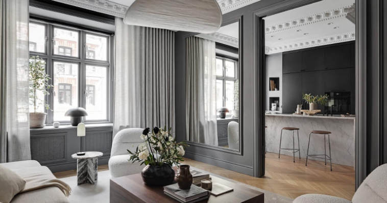 ბინა, რომლის შესახებაც დღეს გიამბობთ, 62 კვადრატული მეტრია და მან სრული ტრანსფორმაცია განიცადა იმისთვის, რომ გამხდარიყო მდიდრული აპარტამენტი მუქი ნაცრისფერი კედლებით, ღია განლაგებითა და ორიგინალური მახასიათებლებით. რემონტის დროს შეიცვალა სამზარეულოსა და მისაღები ოთახის დიზაინი, დაემატა ხის ორმაგი კარი იმისთვის, რომ სურვილის მიხედვით შესაძლებელი ყოფილიყო ღია სივრცის დატოვება ან ორი ოთახის ერთმანეთისგან გამიჯვნა.