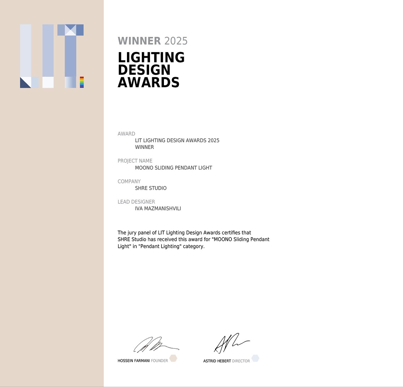 დიზაინისა და განათების სფეროში მოღვაწე ქართული სტუდია Shre Studio საერთაშორისო ასპარეზზე მნიშვნელოვანი წარმატებით წარსდგა — სტუდიის პროდუქტი, სლაიდური სანათი Moono, მსოფლიოს ერთ-ერთ ყველაზე პრესტიჟულ კონკურსში – LIT Lighting Design Awards 2025 – გამარჯვებულად დასახელდა.