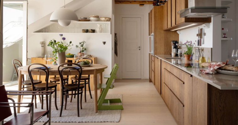ბინის ყველაზე გამორჩეული ელემენტი მუხის სამზარეულოა, რომელიც მის თბილ და ელეგანტურ ხასიათს განსაზღვრავს. მუქი ხის ტონები ინტერიერში კონტრასტს ქმნის თეთრ კედლებთან და ჭერთან მიმართებაში, რაც სივრცეს სიღრმესა და სიმდიდრეს მატებს. ბუნებრივი მასალების გამოყენება ხაზს უსვამს სკანდინავიურ სტილს, რომელიც ფუნქციურობასა და ესთეტიკას იდეალურად ათავსებს ერთმანეთთან.