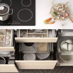 სამზარეულოსთვის შერჩეული პასტელი კარადები, მოდური შავი დეტალები და ფერადი აქცენტები ხელს უწყობს იმას, რომ ბინის ეს ნაწილი სხვა ოთახებისგან აშკარად გამოკვეთილი და გამორჩეული იყოს. ოთახს აქვს სამი კლასიკური ფანჯარა, საიდანაც ბინაში უხვი რაოდენობით ბუნებრივი სინათლე შემოდის. სამზარეულო თანამედროვე ტექნიკითა და ელეგანტური ავეჯით არის დახვეწილი, საერთო ჰარმონია კი შავ-თეთრი ფერების კონტრასტით იქმნება, რასაც კიდევ უკეთ უსვამს ხაზს კედლის მოსაპირკეთებლად გამოყენებული კერამიკული ფილების დიზაინი.