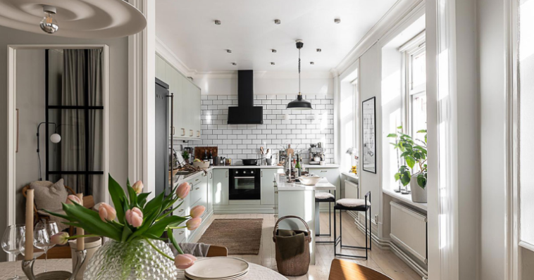 ამ შვედური ბინის ცენტრი არა მისაღები ოთახი, არამედ სამზარეულოა. პროექტის საერთო ფართობი 82 კვადრატული მეტრია, სადაც, როგორც წესი, პროექტის გულს მისაღები ზონა წარმოადგენს ხოლმე, თუმცა, ამ შემთხვევაში, ბინის მეპატრონეები დროის უმეტეს ნაწილს ძირითადად სამზარეულოში ატარებენ, რომელიც ძალიან ცოცხალი და სასიამოვნოა. საცხოვრებელი საკმაოდ ნათელ ფერებშია მოწყობილი და აკმაყოფილებს სკანდინავიური სტილის მთავარ პრინციპებს. სივრცეები ფართო და ნათელია, ავეჯი ფუნქციურობაზე ორიენტირებული და ბინაში ესთეტიკურ განწყობას აღძრავს, ხოლო მკვეთრი აქცენტებისა და ცოცხალი ხასიათის შემოსატანად მწვანე მცენარეებია გამოყენებული.