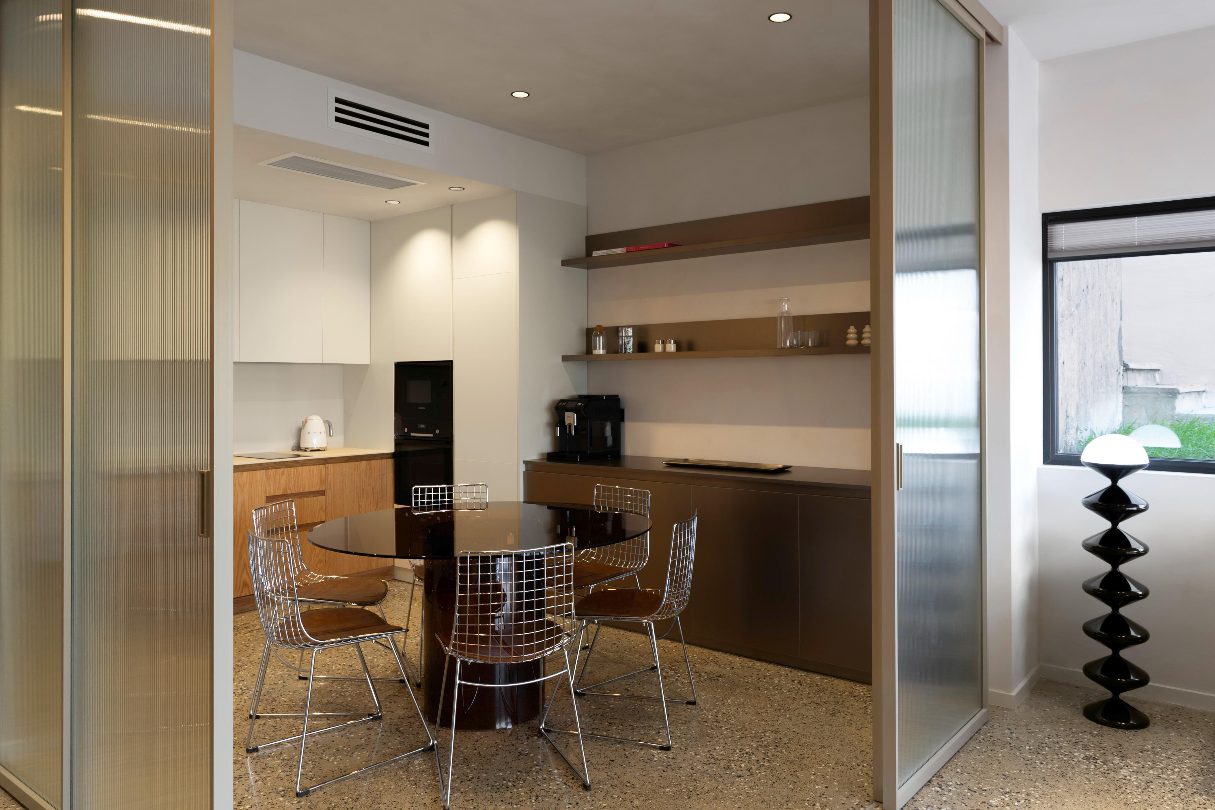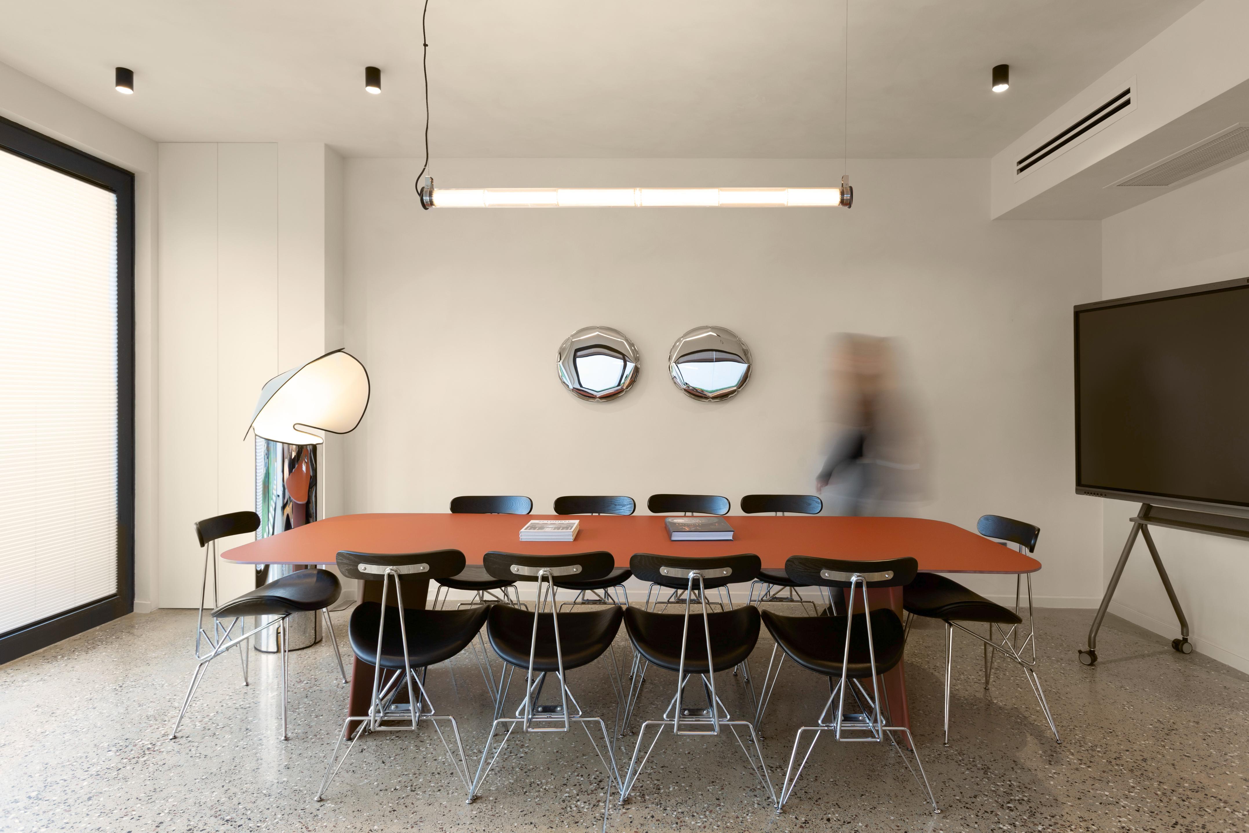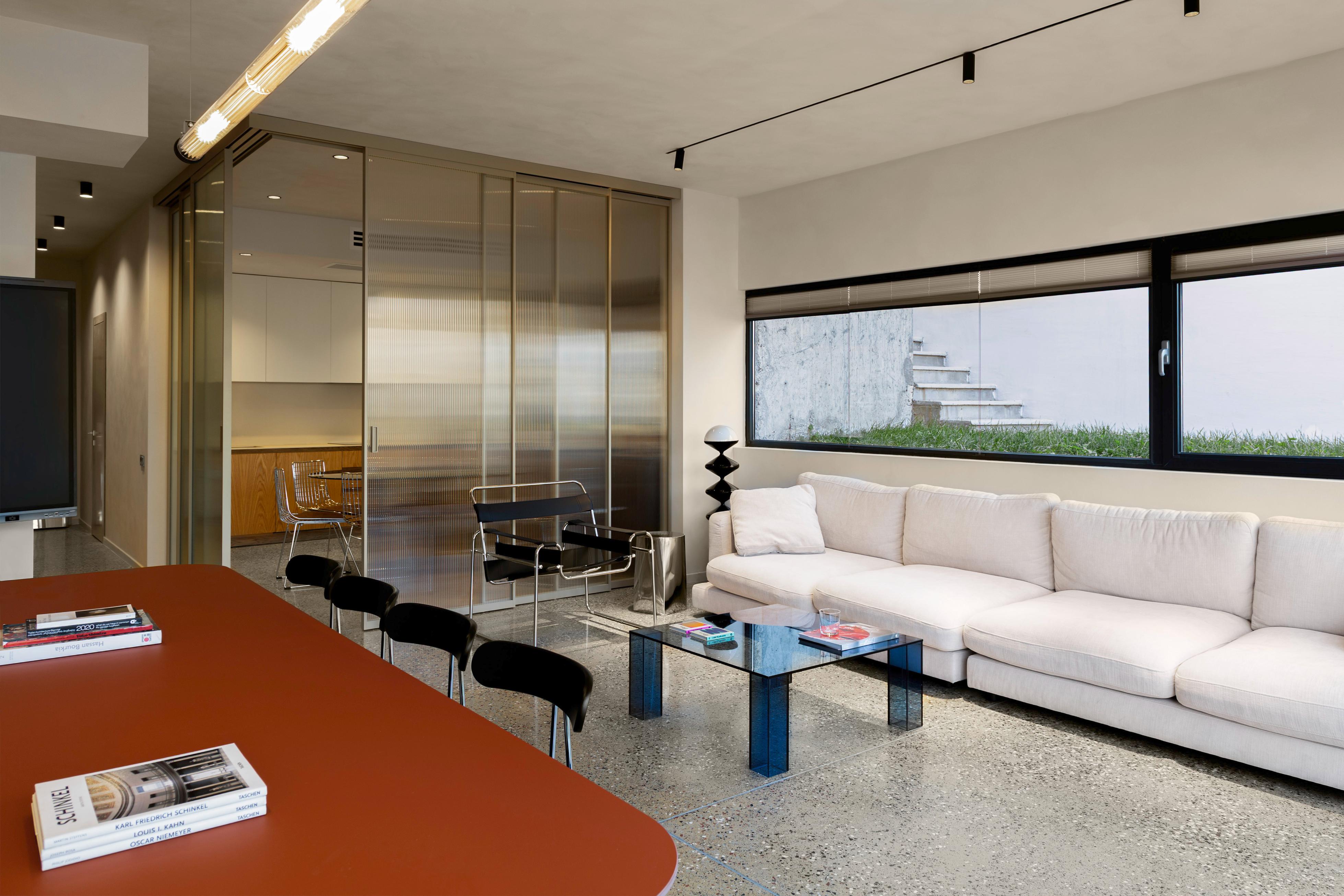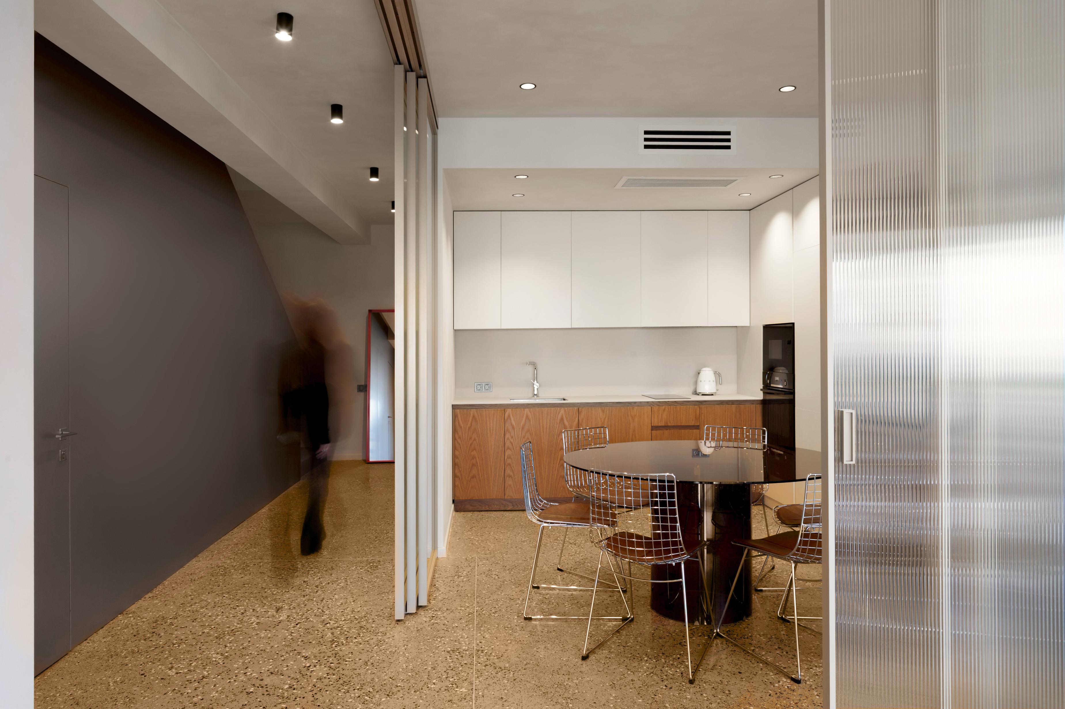 პირველ სართულზე განთავსებულია საერთო გამოყენების სივრცეები. შეხვედრების ოთახი სამზარეულოს ნაწილიდან გამოიყოფა მოძრავი შუშის კარით, რაც საშუალებას აძლევს სივრცეს, იყოს მოქნილად გამოყენებული სხვადასხვა საჭიროებისთვის. ამ ზონაში ინტერიერის დომინანტი დეტალი არის წითელი შეხვედრების მაგიდა, რომელიც ფერის ერთ-ერთ მთავარ ელემენტად იკითხება.
