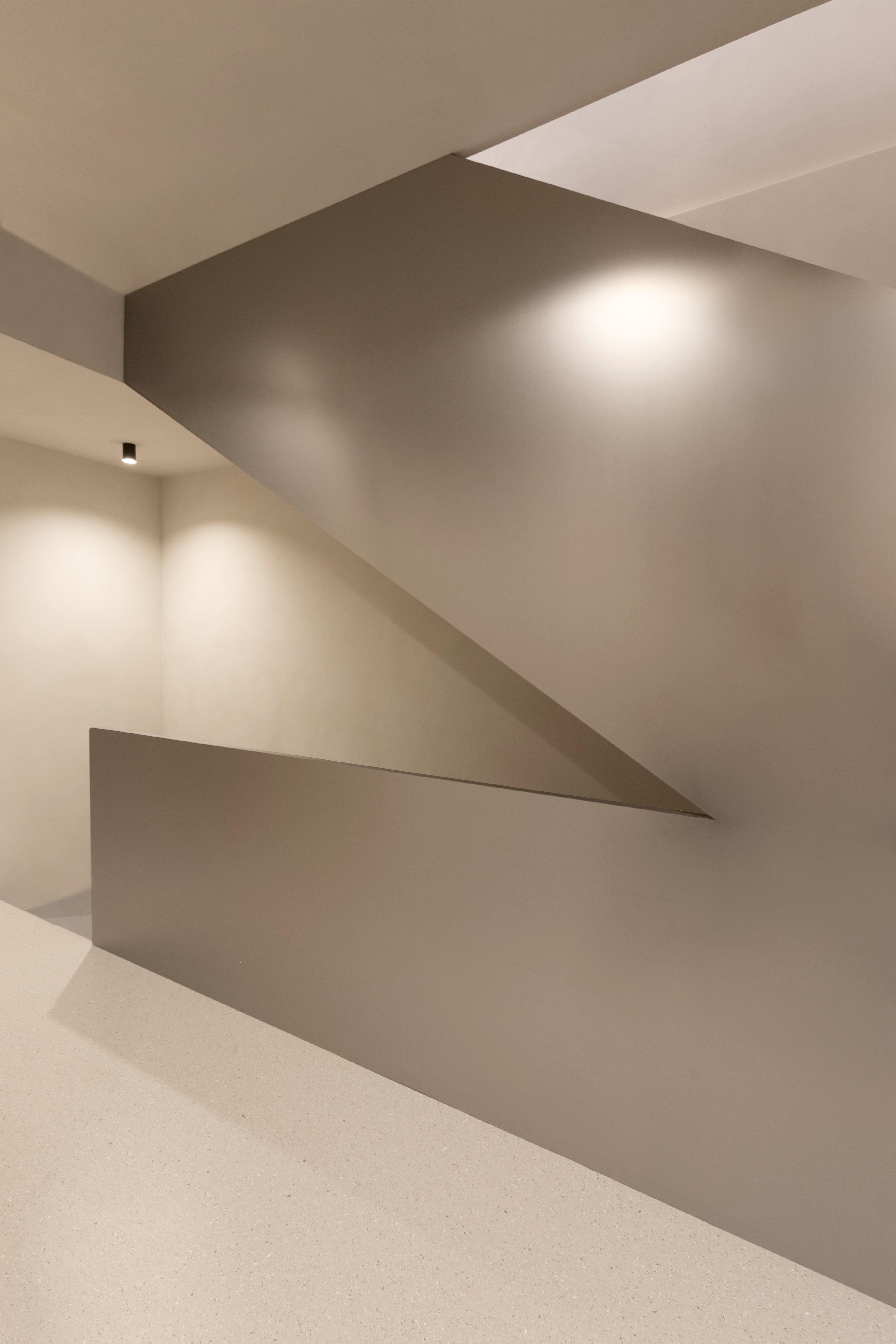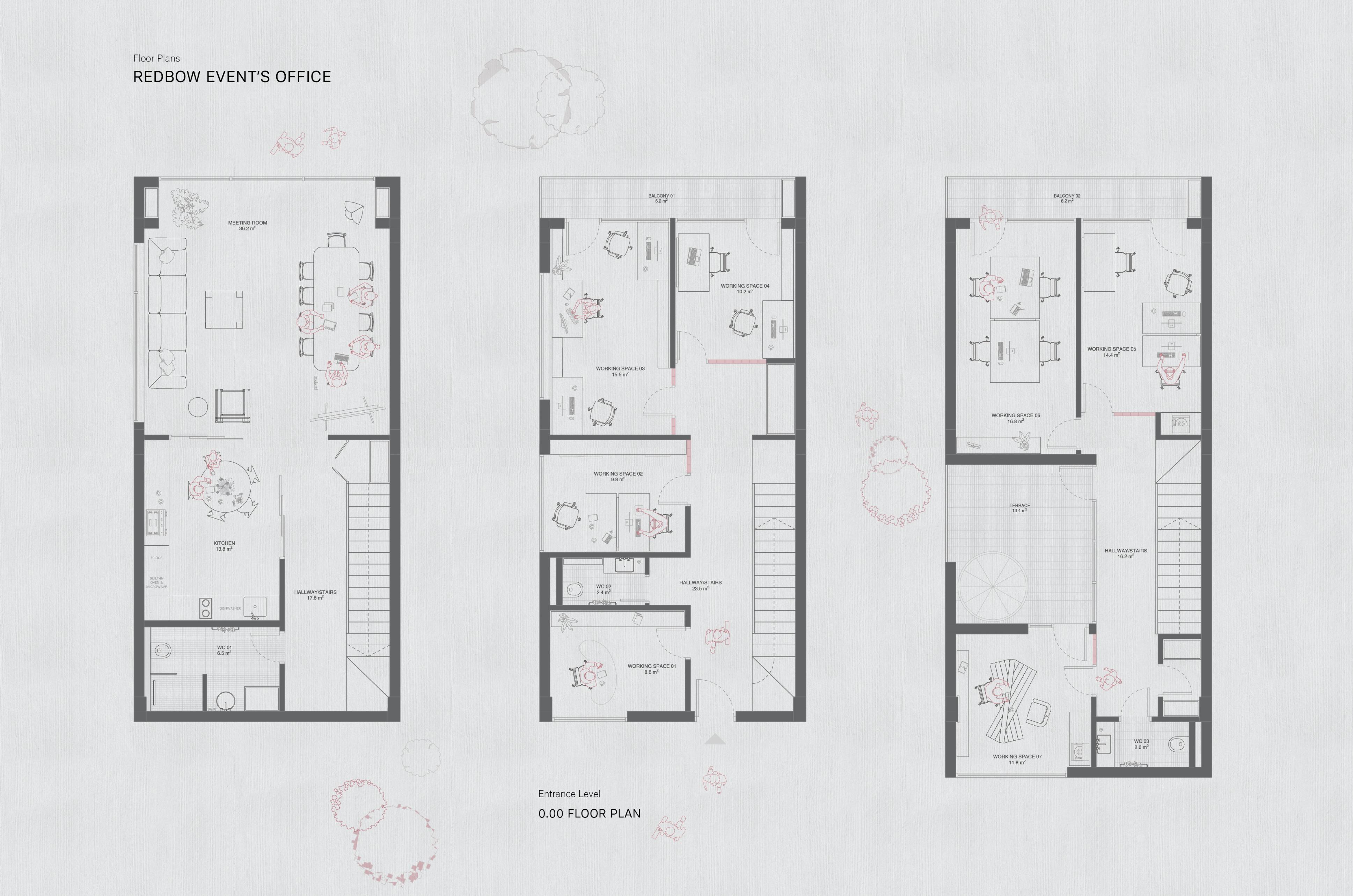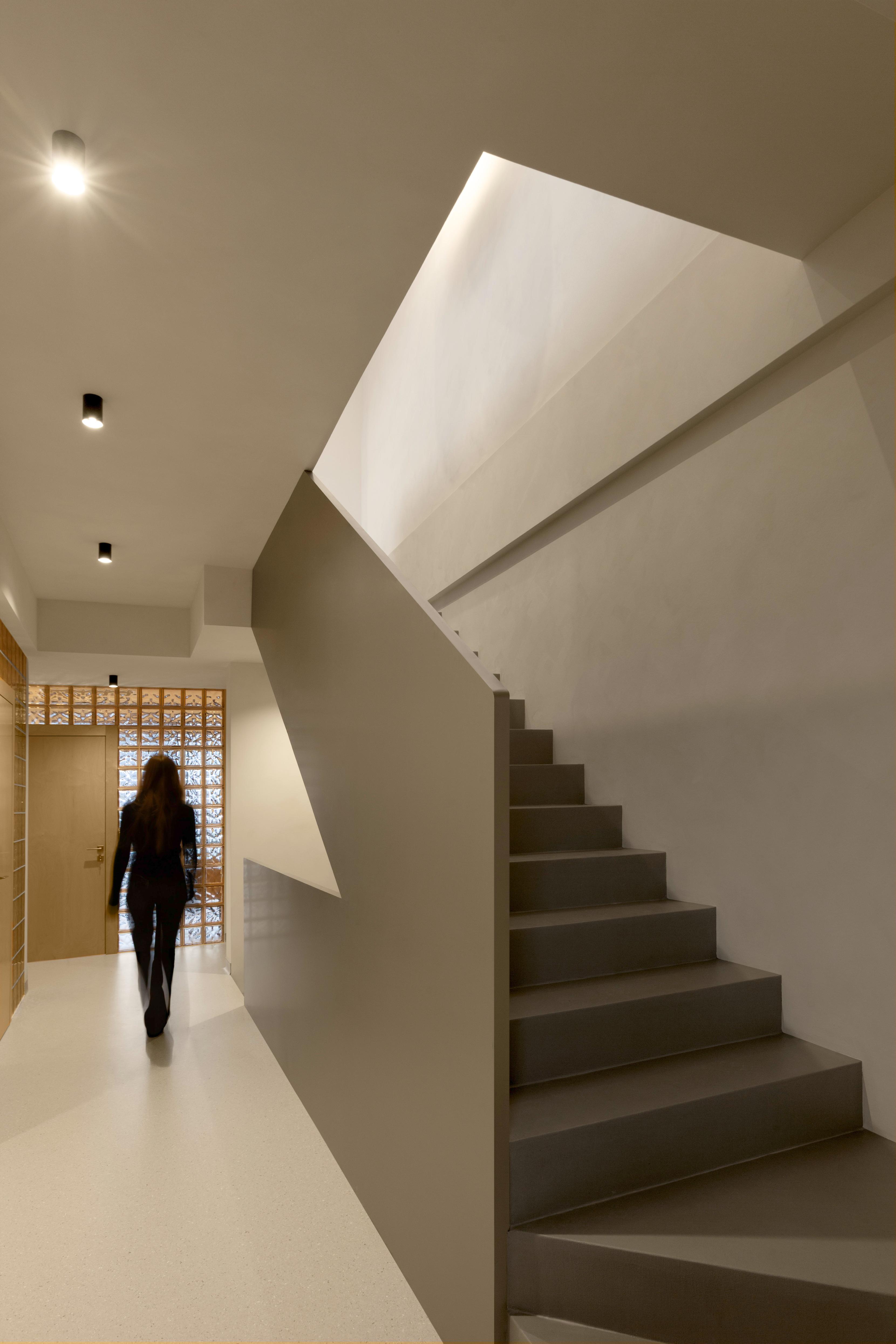 მეორე და მესამე სართულებზე მდებარეობს ინდივიდუალური სამუშაო ადგილები. თითოეული მათგანი გამოყოფილია ვარდისფერი მინა-ბლოკით, რომელიც ბუნებრივ სინათლეს ატარებს და ოფისში ერთდროულად უზრუნველყოფს პრივატულობასა და სიმყუდროვეს. დერეფნებში კი მინა-ბლოკის კედლები ვიზუალურად ყოფს ზონებს და უზრუნველყოფს სინათლის თავისუფალ გავრცელებას.