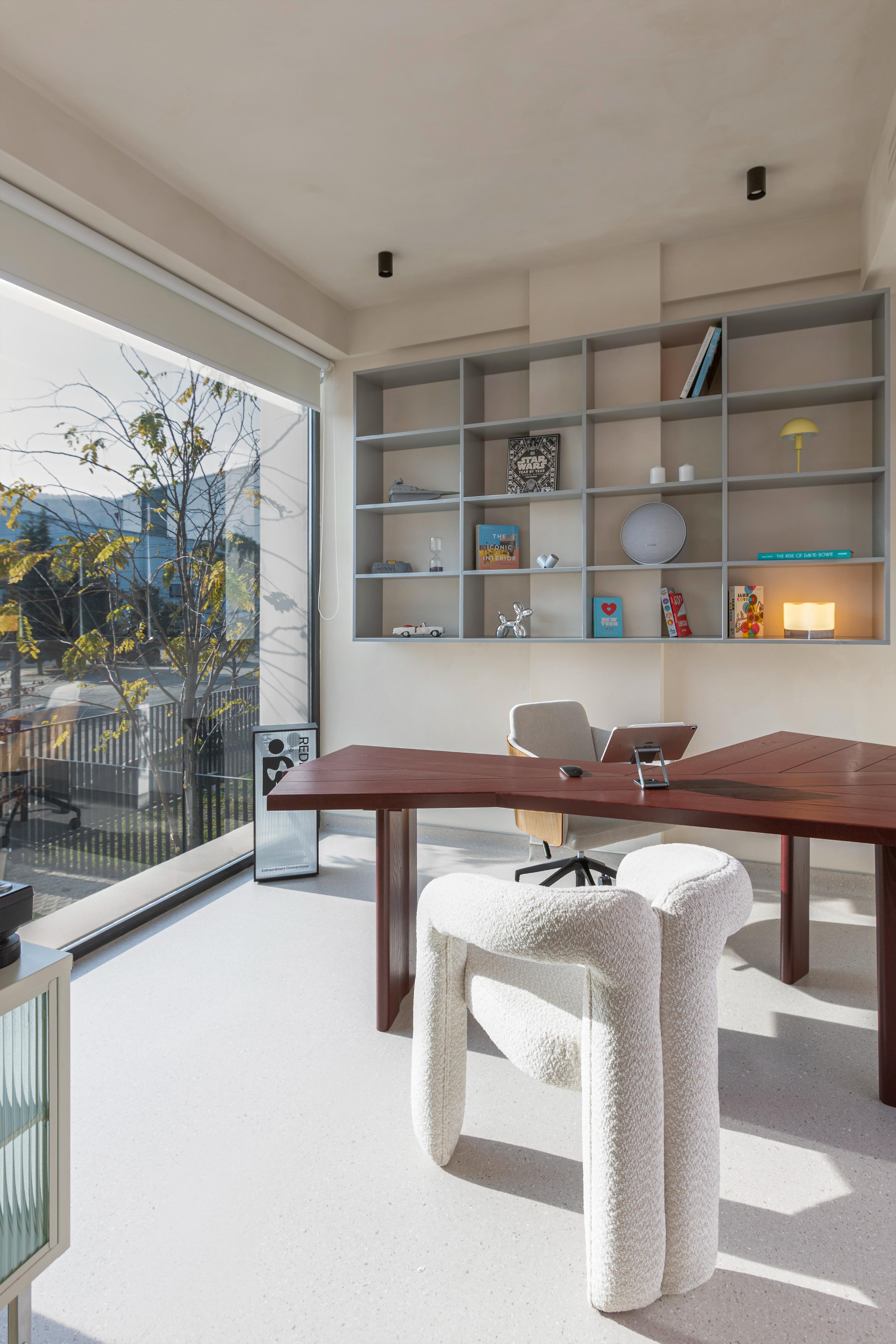 Of a home studio-ს ახალი პროექტი თავიდანვე ჩაფიქრებული იყო არა როგორც სტანდარტული სამუშაო სივრცე, არამედ როგორც გარემო, რომელიც თავად კომპანიის ხასიათს — კრეატიულობას, ენერგიასა და მუდმივ მოძრაობას — გამოხატავს. აქ ინტერიერი არ ცდილობს იყოს ფორმალური ან მკაცრი; პირიქით, ის ქმნის თავისუფალ, ნათელ და ფერად ატმოსფეროს, სადაც ყოველდღიური სამუშაო პროცესიც შემოქმედებით გამოცდილებად გარდაიქმნება. პროექტის მთავარი იდეა იყო ისეთი სივრცის შექმნა, რომელიც ერთდროულად ინარჩუნებს პროფესიულ ორგანიზებულობას და ამავე დროს თანამშრომლებს სთავაზობს კომფორტულ, შთამაგონებელ გარემოს, სადაც დეტალები, მასალები და ფერადი აქცენტები საერთო კონცეფციის ნაწილად ერთიანდება.