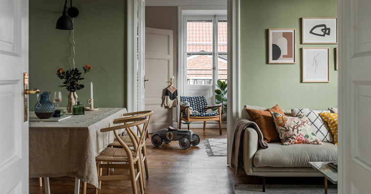 ნაძვისფერი, მინავლებული ტერაკოტა და ბეჟის მშვიდი ელფერები სტოკჰოლმის ამ ოროთახიანი ბინის ინტერიერს ჰარმონიულად ერწყმის.