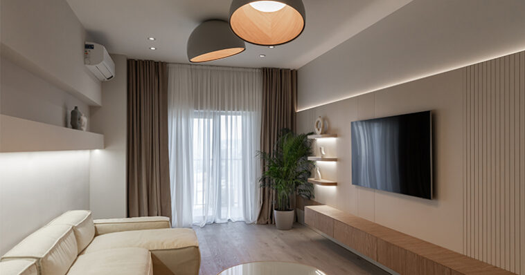 ავეჯის დეტალებზე ნატურალური ხის ფაქტურა ჭარბობს, ჭერზე, უმეტესად, მინიმალისტური განათებებია გამოყენებული. ამ მხრივ გამოირჩევა მისაღები ოთახის Vibia-ს ბრენდის ჭერის სანათი, რომლის სადა, მაგრამ საინტერესო ფორმა იდეალურად ერწყმის ბინის საერთო ესთეტიკას.
