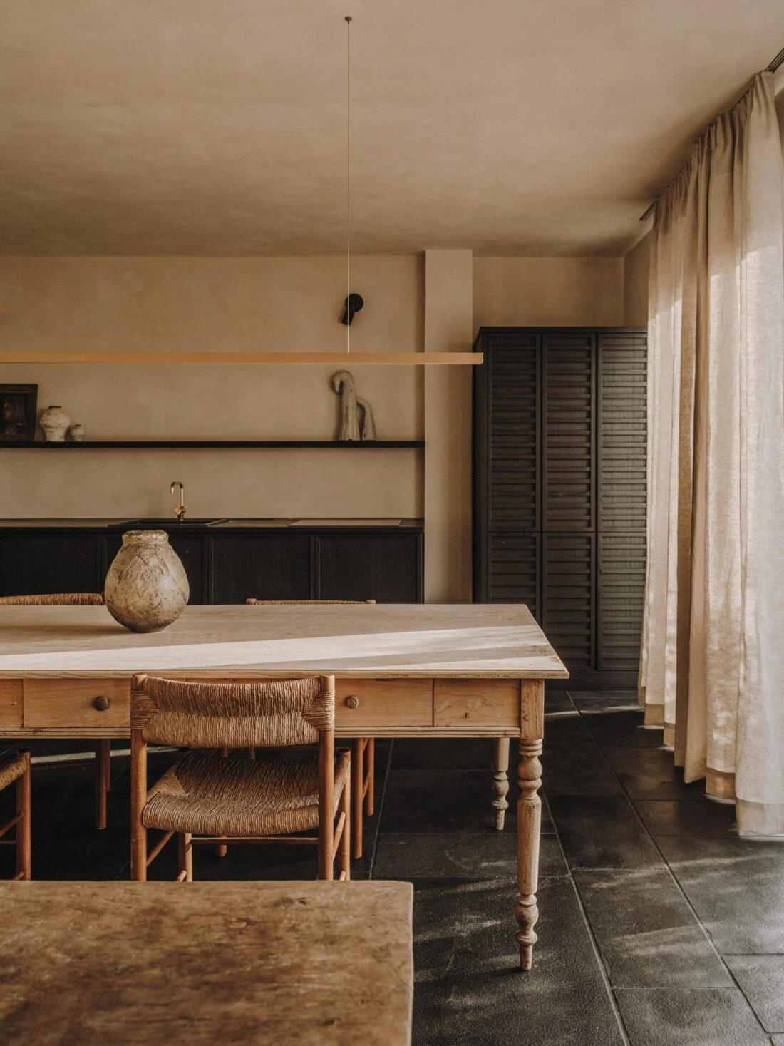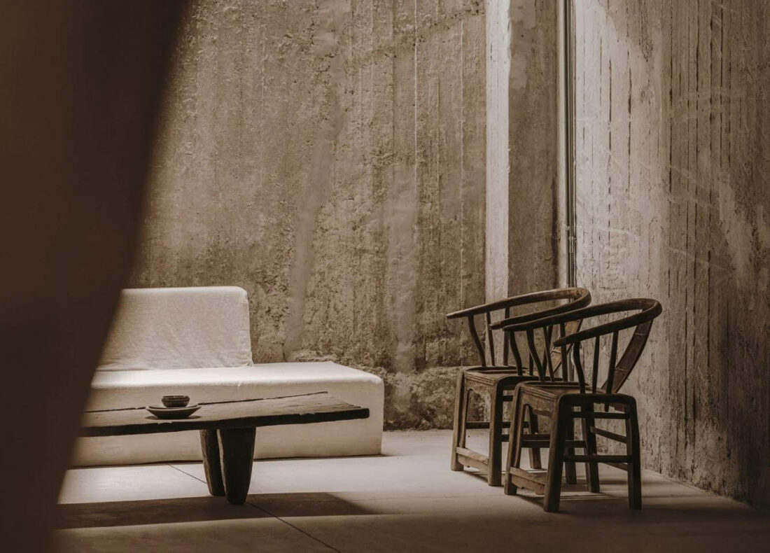 მეორე სართულზე სიმყუდროვისთვის უფრო მშვიდი ფერთა პალიტრა და მასალებია გამოყენებული. კედლები კირის ბათქაშითაა დაფარული და პასტელურ ფერებშია შეღებილი. სურათს ქვიშისფერი ფარდები და მარტივი, ლაკონური ხის ავეჯი ასრულებს.