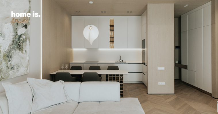 მინიმალიზმისთვის დამახასიათებელი სიცივის ასარიდებლად, ბინაში დომინანტურად ჭარბობს ხის სადა ფაქტურა, რამაც სივრცეს უფრო თბილი და მყუდრო განწყობა მიანიჭა. თუმცა, მონოქრომული ესთეტიკის შესანარჩუნებლად, ხის ფერი ბინის საერთო პალიტრის ღია ტონალობებიდან შეირჩა. სხვადასხვა ობიექტის მიღმა დამალული, თბილი განათებით კი, ინტერიერს განსაკუთრებული სიმყუდროვე და დახვეწილობა შეემატა.