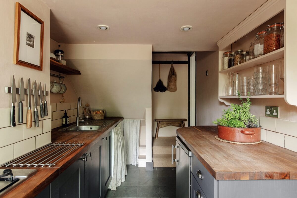 ღია თაროები სამზარეულოს ხიბლს მატებს და, ასევე, ხელს უწყობს ჰაეროვნების შეგრძნების შექმნას, განსაკუთრებით იმის გათვალისწინებით, რომ ოთახი დიდი არ არის და ერთ მხარეს დახრილი ჭერი აქვს.