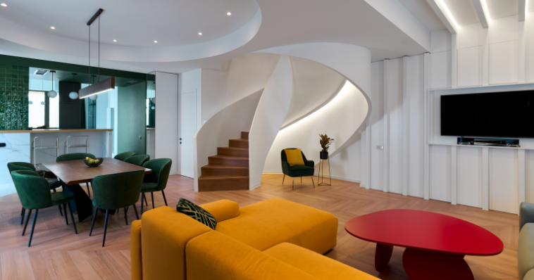 წყვილის მოთხოვნით, კიბე უნდა ყოფილიყო გამორჩეული და განსაკუთრებული ელემენტი სახლში, რათა მას ნებისმიერი მნახველის ყურადღება მიეპყრო. შესაბამისად, პირვანდელ გეგმარებაში მოცემული კიბის ჩვეული ფორმები ოვალურით შეიცვალა, რის შედეგადაც ერთი მხრივ, სივრცე გაიზარდა, მეორე მხრივ კი კიბის დიზაინი ორგანულად შეერწყა აპარტამენტის საერთო კონცეფციას. კიბე ჭერის ოვალურ ფორმას იმეორებს, განათება კი კიდევ უფრო მეტად უსვამს ხაზს კიბის ფორმებს, რაც ბინის მთავარ ელემენტს უფრო აქცენტირებულს ხდის. კედელსა და ჭერზე არსებული ვერტიკალური ზოლები, რომლებიც ასევე განათებებით გამოიკვეთა, ბინაში რიტმულობას ქმნის.