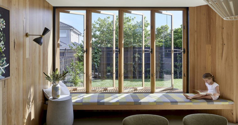 ამ სახლში კი ფანჯრის რაფა ამერიკულ სტილში დასაწოლ და საკითხავ სივრცედაა გადაკეთებული, რომელსაც გვერდით მომცრო ბიბლიოთეკაც კი ახლავს. წასაკითხი ზონა კომპაქტური და დასრულებული გამოვიდა. თაროების ასეთი განლაგების წყალობით (მისაღები ოთახიდან ისინი არ ჩანს) მასპინძლებს წიგნების ფერების მიხედვით დახარისხებაზე წვალება არ უწევთ.