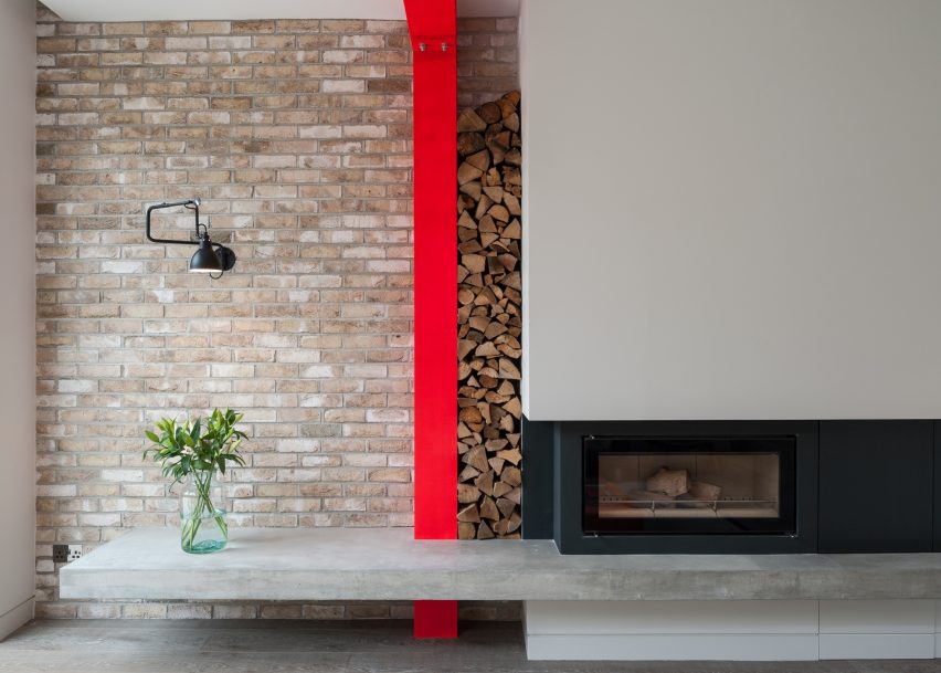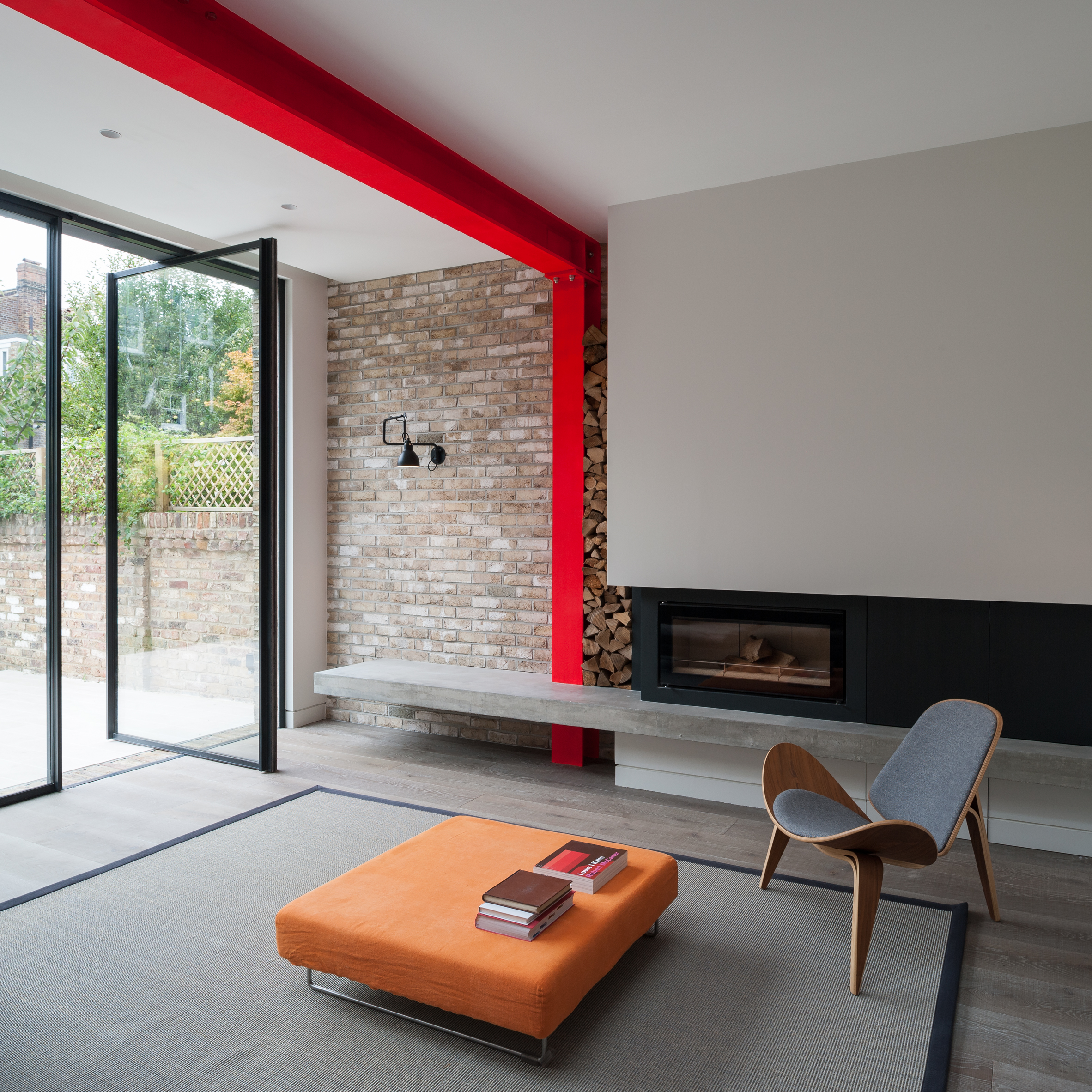 ლონდონის ამ სახლში,  მეტალის დამჭერი კოჭი მკვეთრ წითელ ფერშია შეღებილი. ამით დიზაინერებმა შეძლეს, რომ სახლის ტრადიციულ ინტერიერში მხიარული და ცოცხალი ატმოსფერო შეექმნათ.