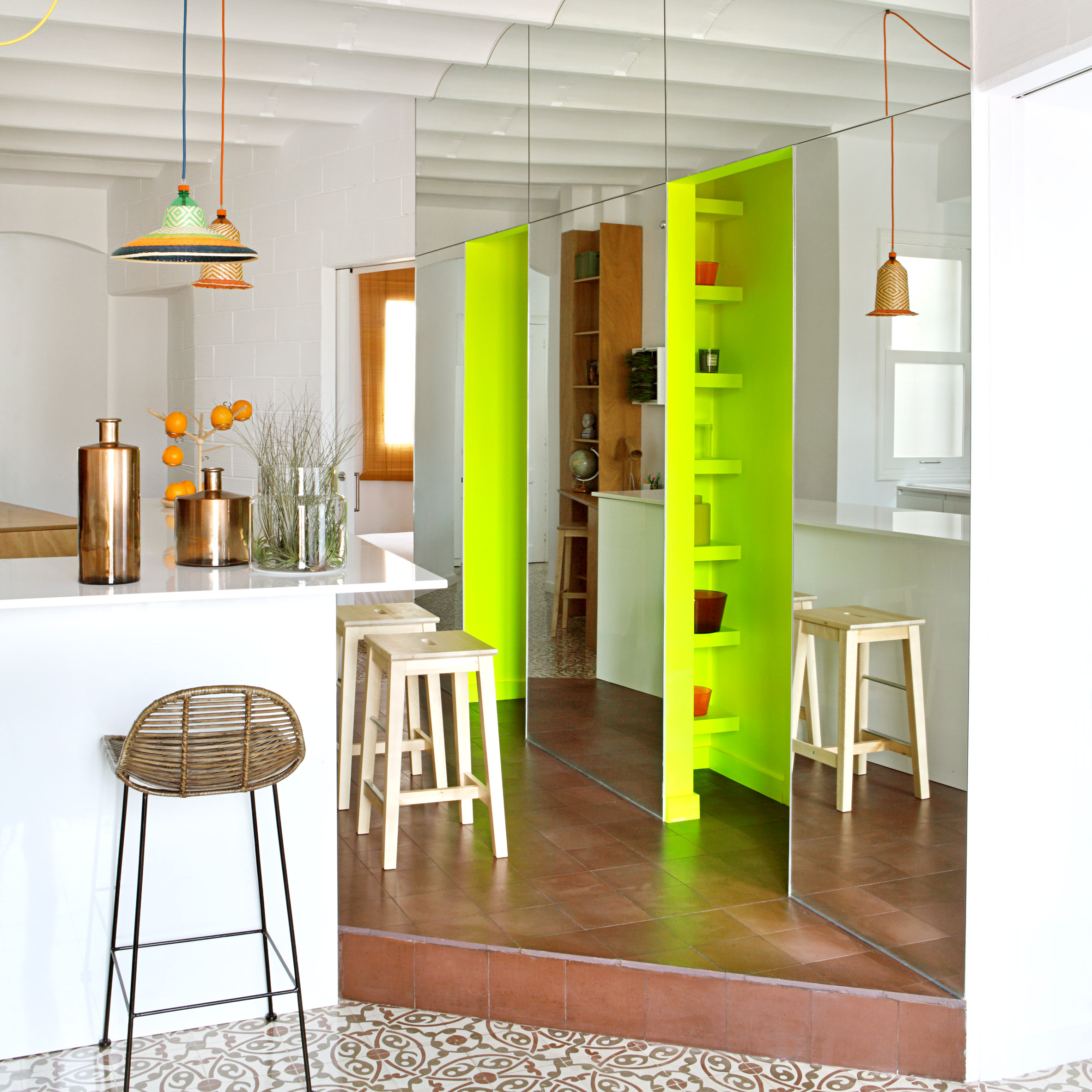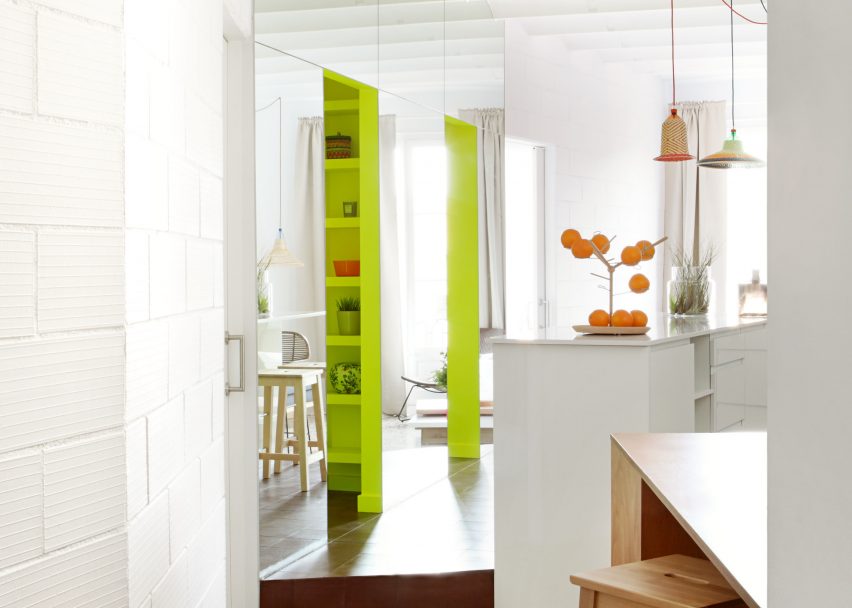 Miel Arquitectos- მა ბინას სხვადასხვა თამამი და კაშკაშა ფერები დაამატა. სივრცის ფოკუსი სარკის კედელზე მოდის, რომელიც ფოსფორისფერი მწვანე შესანახი სივრცეებით წყდება.