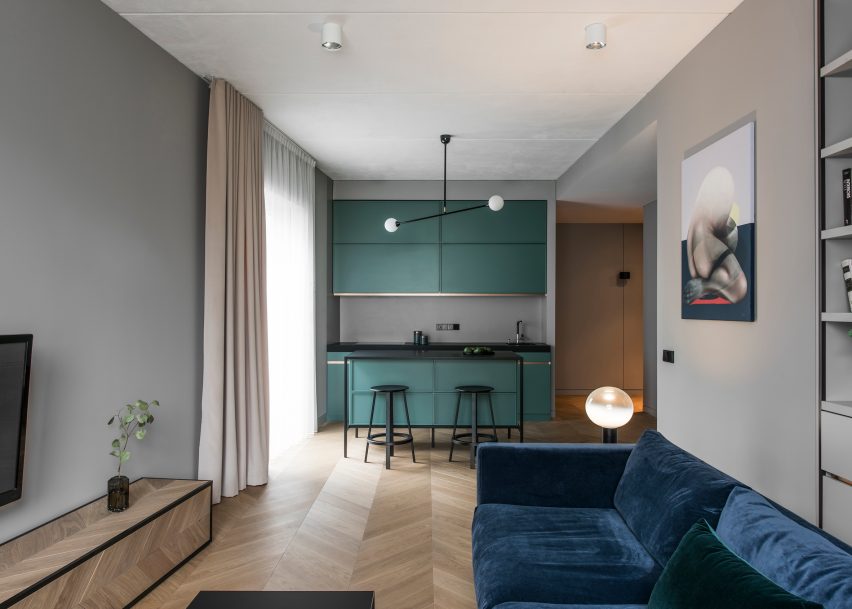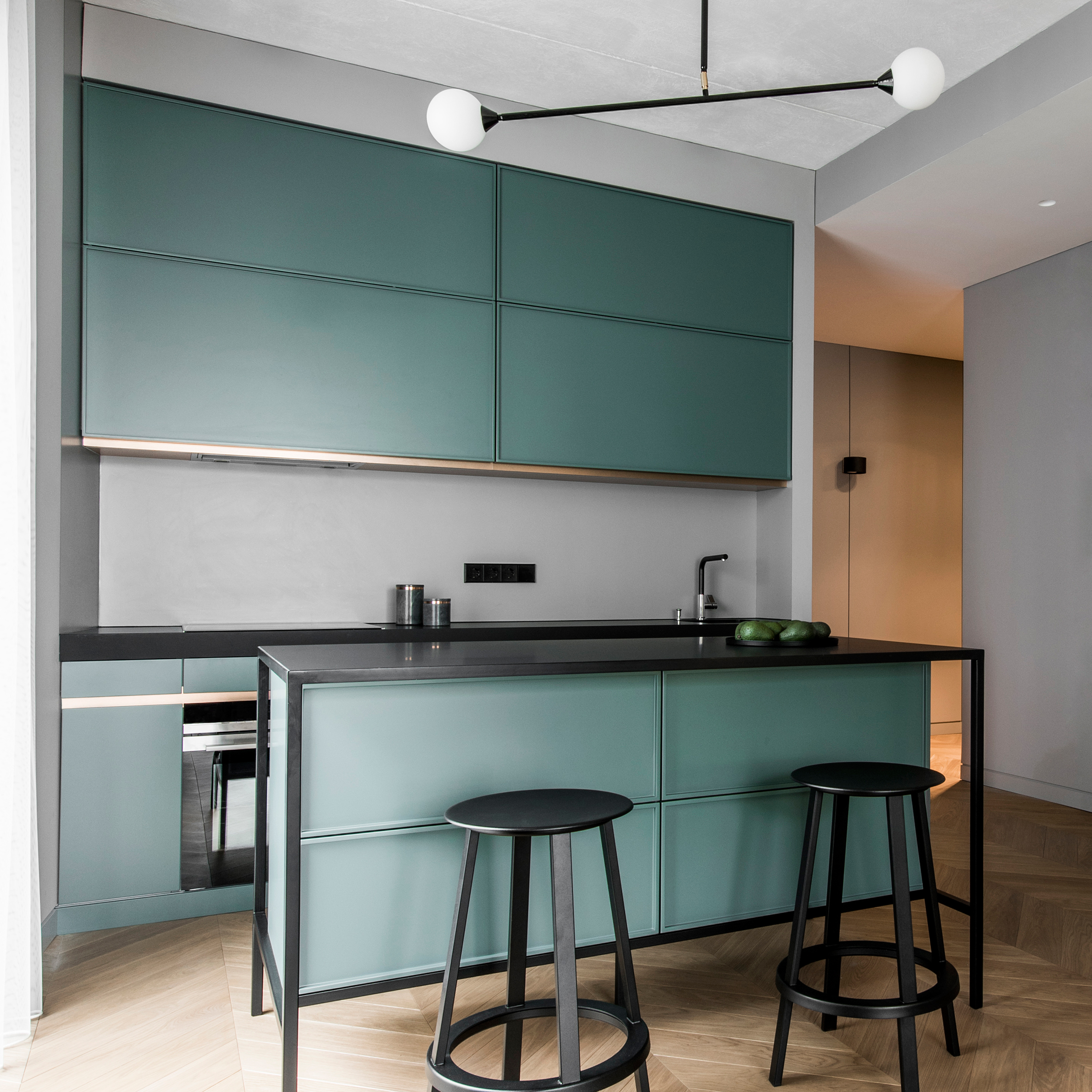 ვილნიუსის ამ ბინის სამზარეულოში, სასადილოსა და მისაღებ ოთახში განთავსებულია ფერადი ავეჯი, რომელიც შავი ლითონის დეტალებით არის შემკული. სივრცეს სამზარეულოს მწვანე  კარადები და ხავერდოვანი ლურჯი ტახტი კიდევ უფრო საინტერესოს ხდის.