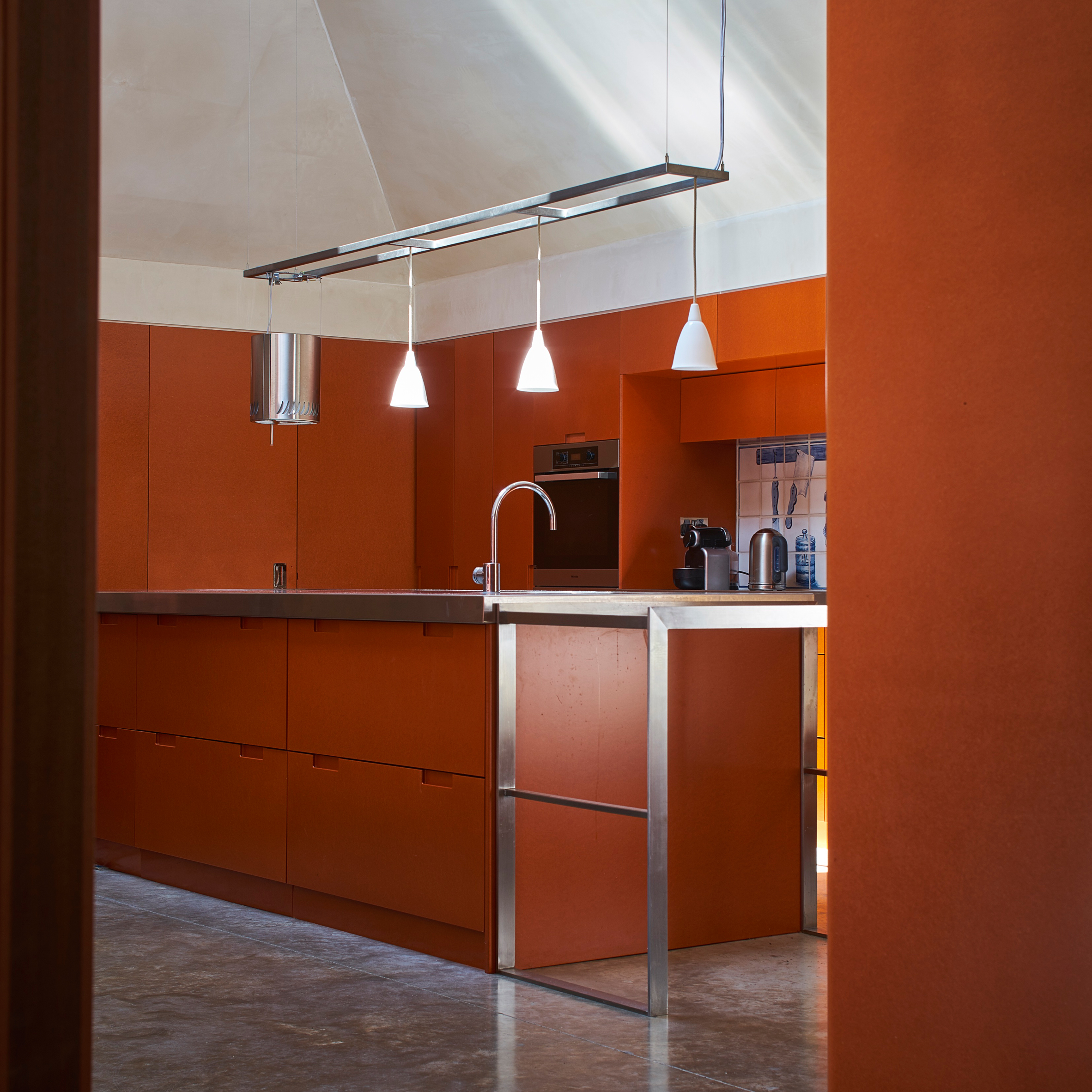 კარადები და კედლები ნარინჯისფერ ტონალობაშია გადაწყვეტილი, რომელიც ფოლადით მოპირკეთებულ ინტერიერს ძალიან უხდება. ამ გზით ცივ ინტერიერში ფერს სითბო შემოაქვს.