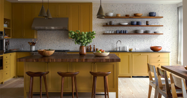 თუ მთელი ოთახის ყვითლად შეღებვა მეტისმეტი გეჩვენებათ, ეს ფერი მხოლოდ სამზარეულოს კარადებისთვის გამოიყენეთ. ქვემოთ მოცემული ფოტო ნამდვილად შთაგაგონებთ.