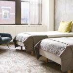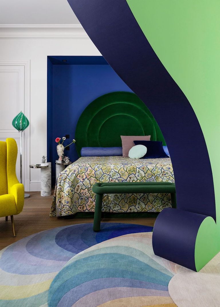 საძინებელიც აგრძელებს სახლის ფერად ხაზს და აქ უკვე გვხვდება მუქი ლურჯი და სალათისფერი თაღი, რომლის მიღმაც მუქი მწვანე საძინებელი იმალება. საძინებლის გვერდით კი განთავსებულია ორი ასევე სალათისფერი რბილი სკამი და კოქტეილის მაგიდა.