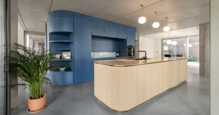 ახალი სახლისთვის გაპრიალებული ბეტონის იატაკი შეირჩა. მოსასვენებელ ზონაში, სადაც მოსასვენებელი სივრცე და სათამაშო მოედანია განთავსებული, კონტრასტული მუხის პარკეტი დაიგო. სახლის ცენტრში ვხვდებით ხასხასა ლურჯი ფერის ბირთვს, რომლის ერთ მხარეს საპირფარეშო, გარდერობი და კიბეა განლაგებული, ხოლო მეორე მხარეს – სამზარეულო და საკუჭნაო. სამზარეულოს მომრგვალებულ კუნძულს, რომელიც ბუნებრივი ხის ტონშია მოპირკეთებული, ატმის ფერის ზედაპირი აქვს. სპილენძის აქცენტებთან ერთად, ეს ოთახის თანამედროვე და მდიდრულ იერს ერთგვარი მთლიანობის განცდას ანიჭებს.