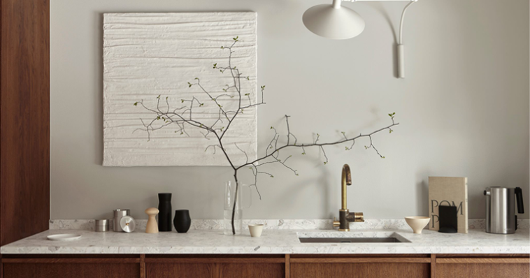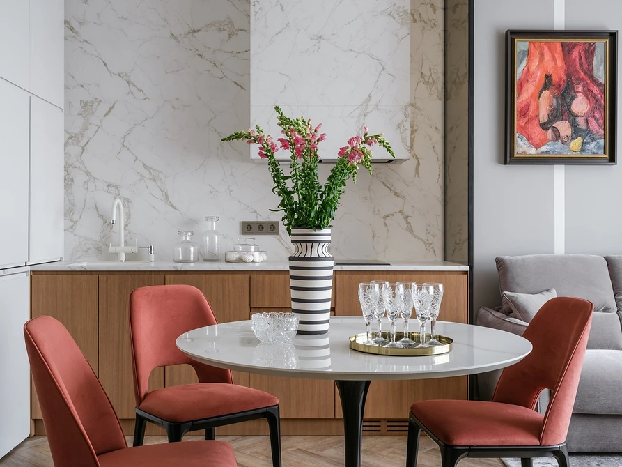 სამზარეულოს ზედაპირის ზემოთ კარადები არც ამ პროექტშია, რაც კომპენსირდება ოთახის მეორე კედელზე არსებული მაღალი ვერტიკალური კარადებით. სამუშაო ზედაპირის ზემოთ მოთავსებულია დეკორატიული ნივთები. დიდი მართკუთხა სარკე ელეგანტურად, მდიდრულად გამოიყურება და ვიზუალურად სივრცეს ოდნავ აფართოებს. გარდა ამისა, მას რეტრო განწყობა შემოაქვს — მსგავსი ტექნიკა ადრე გამოიყენებოდა იმ ზონების დიზაინში, სადაც დივნებია განთავსებული. ასევე აღსანიშნავია დეკორატიული „გვირგვინი“ და სამი იდენტური ბრა, რომელიც სამუშაო ზონას ანათებს.