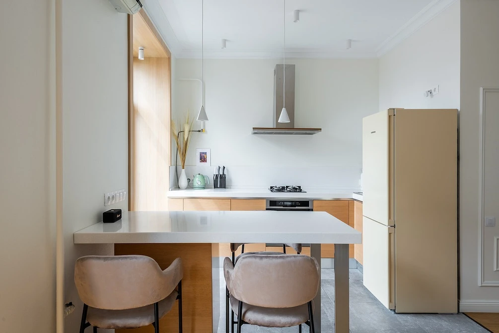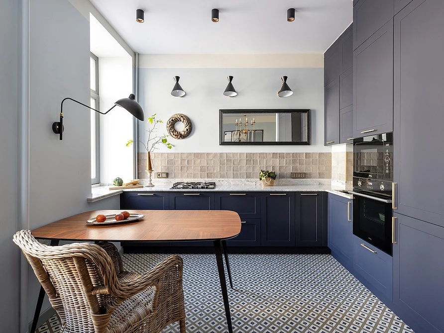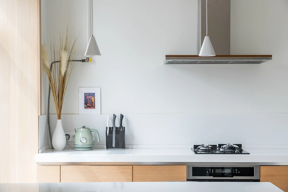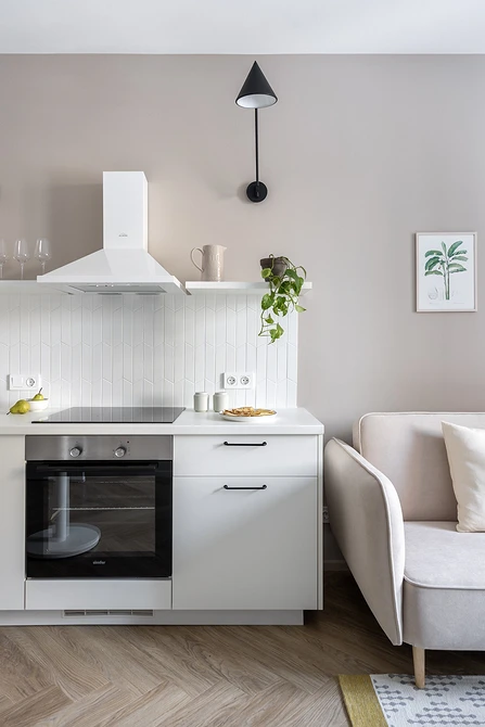 ამ ბინაში ვხედავთ უკვე ნაცნობ ხრიკს — ზედა კარადების არარსებობა ერთ კედელზე და ვერტიკალური კარადები — მეორეზე. ღუმელისა და ნიჟარის ზემოთ მდებარე ზედა კარადები ჩანაცვლებულია მინიმალისტური თაროებით, რომლებიც წინსაფრისა და სამზარეულოს ზედაპირის ფერშია გაფორმებული. სამუშაო ზონის გასანათებლად კედელზე დამონტაჟებულია სანათი.