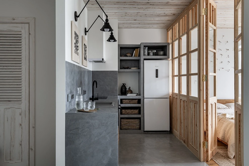 ამ პროექტში სამზარეულო კომპაქტურია და სხვა სივრცეებისგან არ არის გამოყოფილი, რადგან ეს ბინა სტუდიოს ტიპისაა. აქ ზედა კარადებს ანაცვლებს ღია თაროები, რომლებიც ჭურჭლისა და დეკორისთვის არის განკუთვნილი.