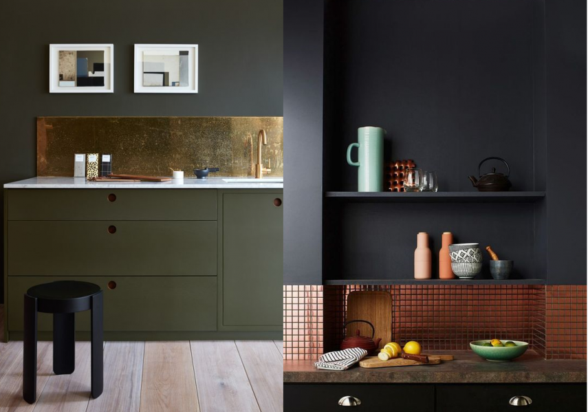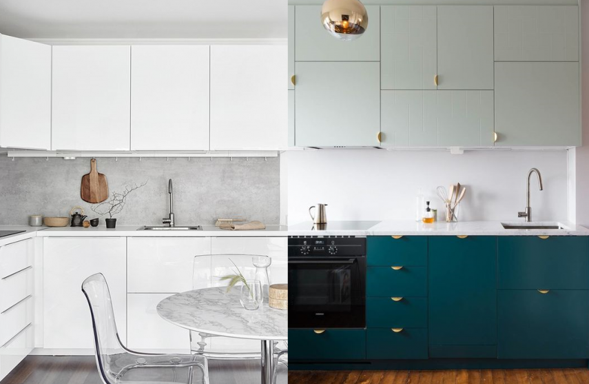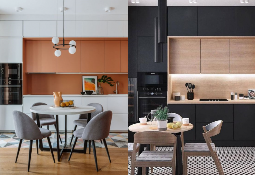საინტერესოდ გამოიყურება წინსაფრები, რომელთა ფერი მიბაძავს კარადების მხოლოდ ზედა ან მხოლოდ ქვედა რიგს.