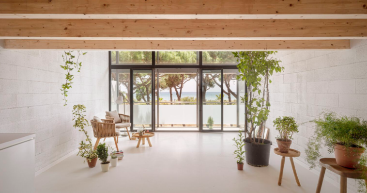 დიზაინი ორ სამშენებლო სტრატეგიას გვთავაზობს. პირველი, იატაკისა და ბეტონის ბლოკის კედლების თეთრად შეღებვით, სახლის მაქსიმალურად განათებას უზრუნველყოფს. მეორე დიზაინის სტრატეგია აქცენტს აკეთებს ჰორიზონტალურ სიბრტყეზე. ხის ფიცრები, ახალ აბსტრაქტულ გარემოსთან კონტრასტს ქმნის. მასალების არჩევანი როგორც ესთეტიკის ძიებას, ასევე მდგრადი ჩარევის მიღწევას ეხმაურება.