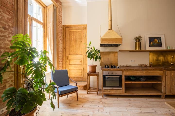 ეს დახვეწილი ბინა თბილისის ერთ-ერთ ძველ უბანში, კერძოდ კი ჭონქაძის ქუჩაზე მდებარეობს. სივრცის საერთო ფართობი 50 კვადრატულ მეტრს შეადგენს და მასში 2 ოთახი მოთავსდა.