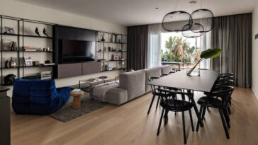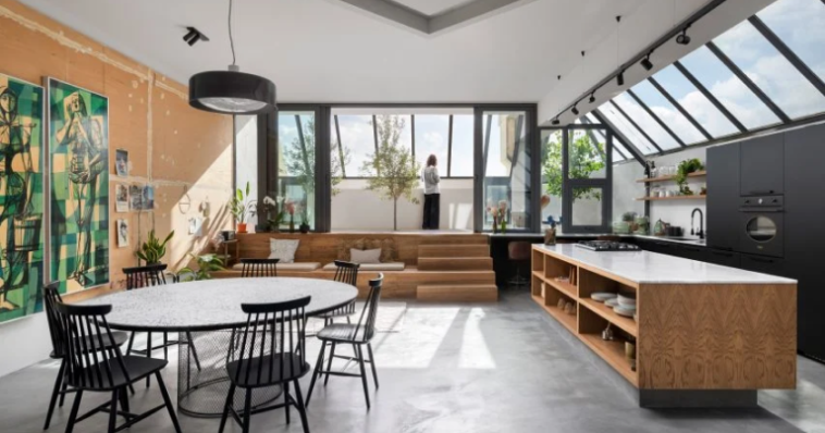 ეს მიზანი მიღწეულ იქნა სივრცეში ხის იატაკის დამატებითი დონის ჩართვით და, შედეგად, ერთგვარი ღია ცის ქვეშ მდებარე ტერასა შეიქმნა, რომელიც ინტერიერისგან მინის სრიალა კარის მეშვეობით არის გამოყოფილი. ხის რამდენიმე საფეხური, რომლებიც დასაჯდომადაც გამოდგება, ჩადის სამზარეულოში, რომელიც შავი ფერის კარადებითა და დიდი კუნძულით არის აღჭურვილი.