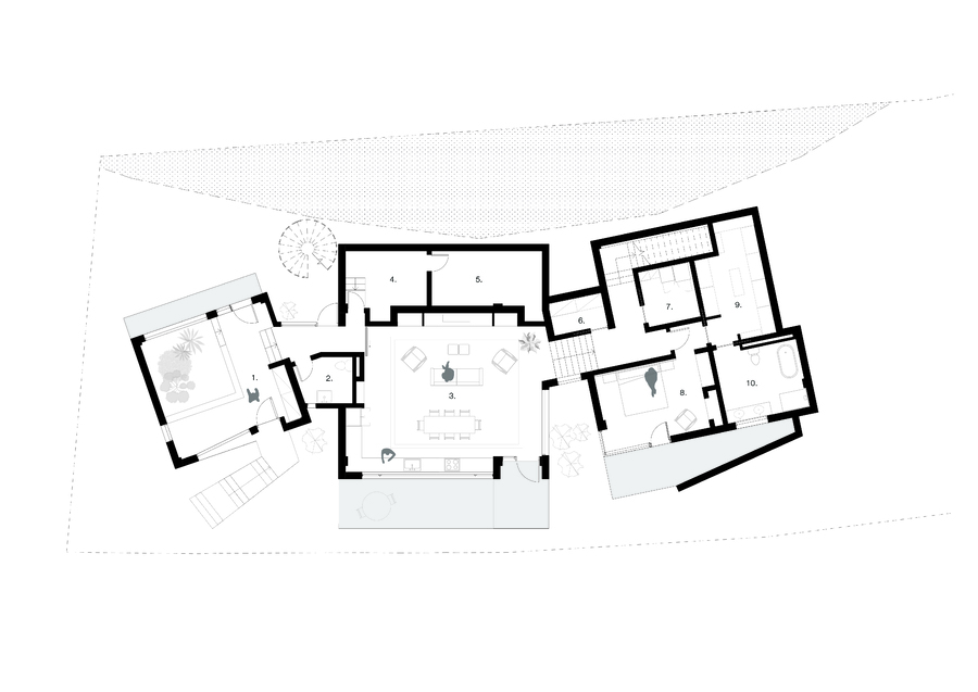 რთული რელიეფის გათვალისწინებით, ფუნქციები პროგრამულად სამ ბლოკად გადანაწილდა. ბლოკების მიმართულება, ორიენტაციისა და ლანდშაფტის გარდა, ფუნქციების ურთიერთკავშირმაც განსაზღვრა. ბლოკების მიმართულების ცვლილების შედეგად გაჩნდა ლანდშაფტთან ნახევრად გახნილი სივრცეები,” – MUA Architecture & Placemaking-ის გუნდი