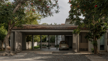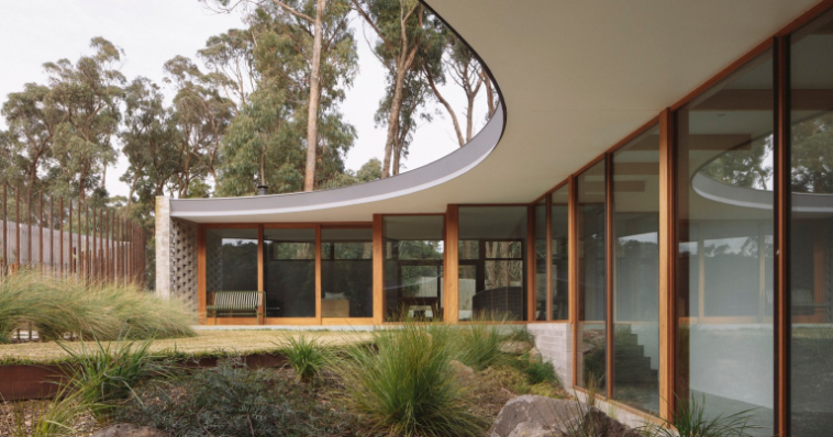 სახლი, რომლის შესახებაც დღევანდელ სტატიაში გიამბობთ, 2023 წელს აშენდა ავსტრალიაში და მისი საერთო ფართობი 280 კვადრატული მეტრია. მისი არქიტექტურა განიხილება როგორც მარტივი და ძლიერი სტრუქტურა, რომელიც იდეალურად ასახავს გარშემო არსებულ ლანდშაფტს. დიზაინი ითვალისწინებს ეზოს, რომელიც ისეა მოქცეული შენობის შიგნით, რომ მაქსიმალურად უზრუნველყოს მზის ბუნებრივი შუქის სახლში მოხვედრა. ცენტრალური ღია სივრცე დაპროექტებულია მაღალი ხეების გარშემო, რაც სასიამოვნო ურთიერთკავშირს ქმნის შენობასა და ბუნებას შორის. ამავე მიზანს ემსახურება მრუდი სახურავის ხაზიც, რომელიც სინქრონულად მიუყვება გარშემო არსებულ ფერდობებს.