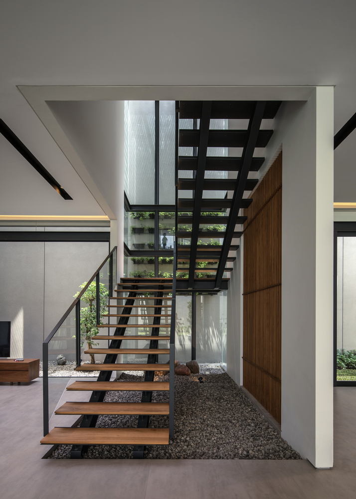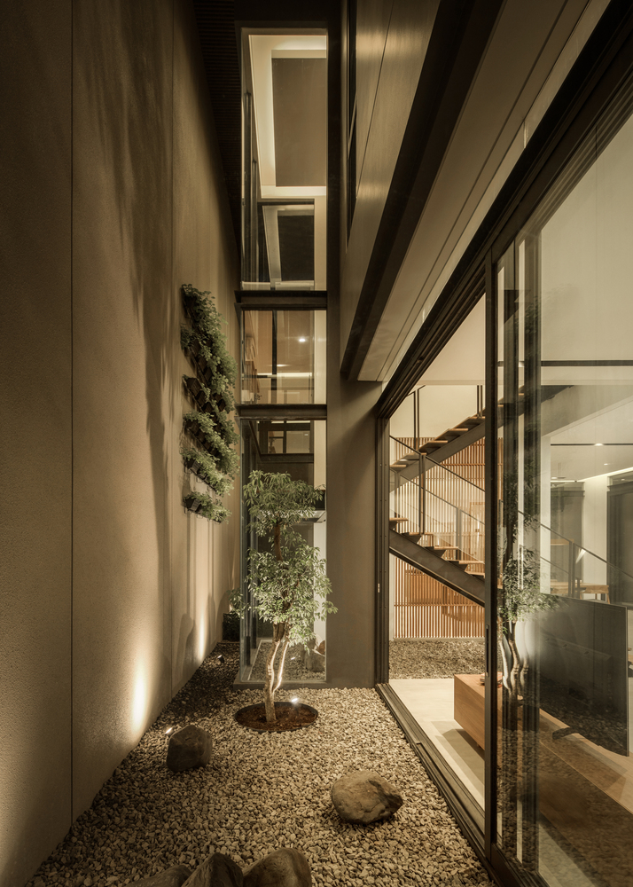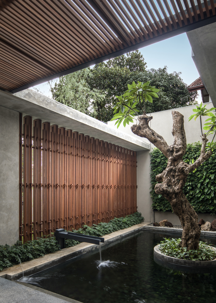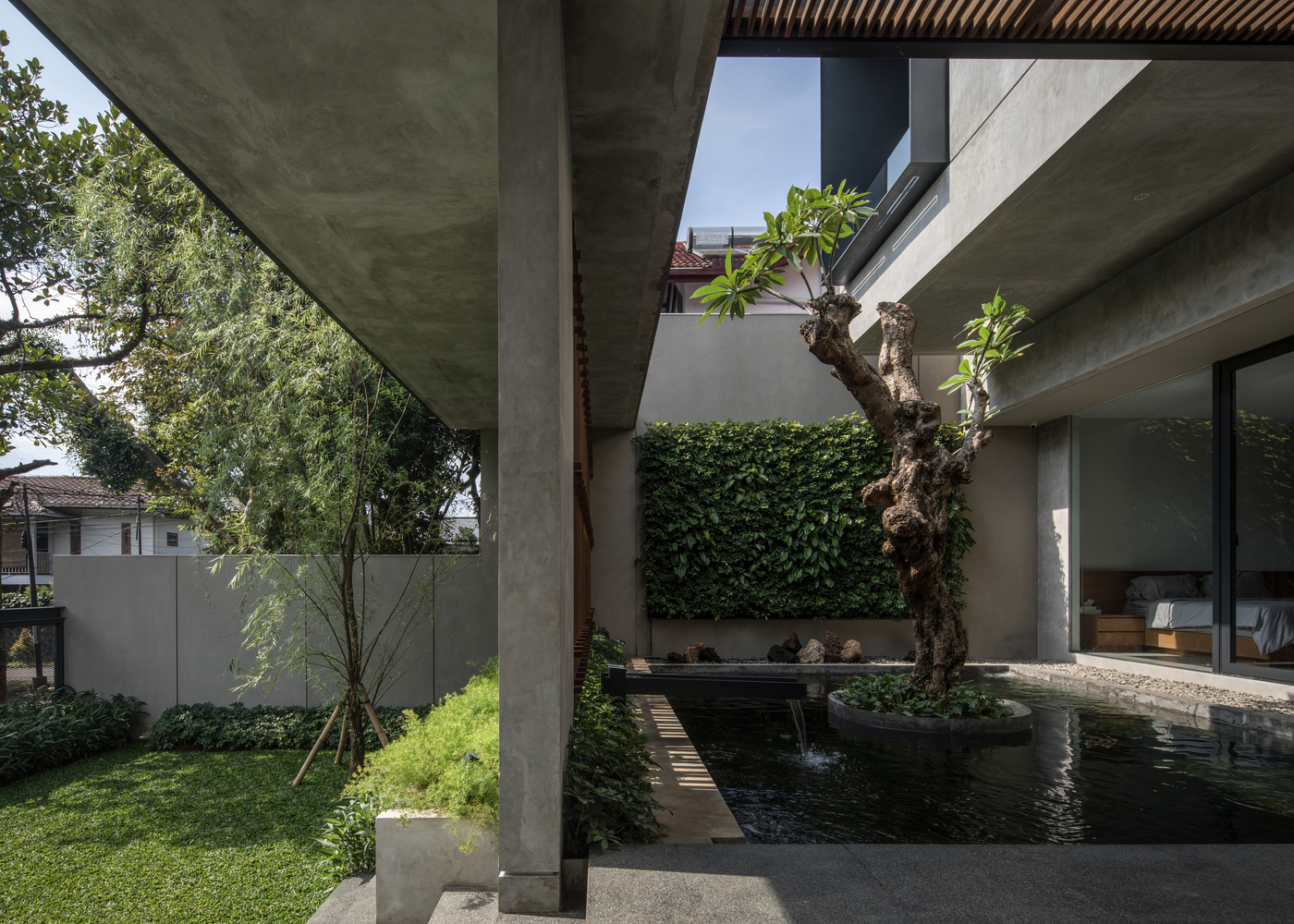 სახლის ძირითადი სამი ელემენტი – ხე, ცემენტი და მცენარეული საფარი გვხვდება როგორც ექსტერიერში, ასევე ინტერიერში, რაც გარეთა და შიგნითა დიზაინს ერთმანეთთან აკავშირებს და საერთო ჯამში იდეალურ ბალანსს აყალიბებს. სიმწვანე ხისა და ცემენტის სიმკაცრეს ათბობს და ვიზუალურადაც ერთობ ორიგინალურ სანახაობას ქმნის.