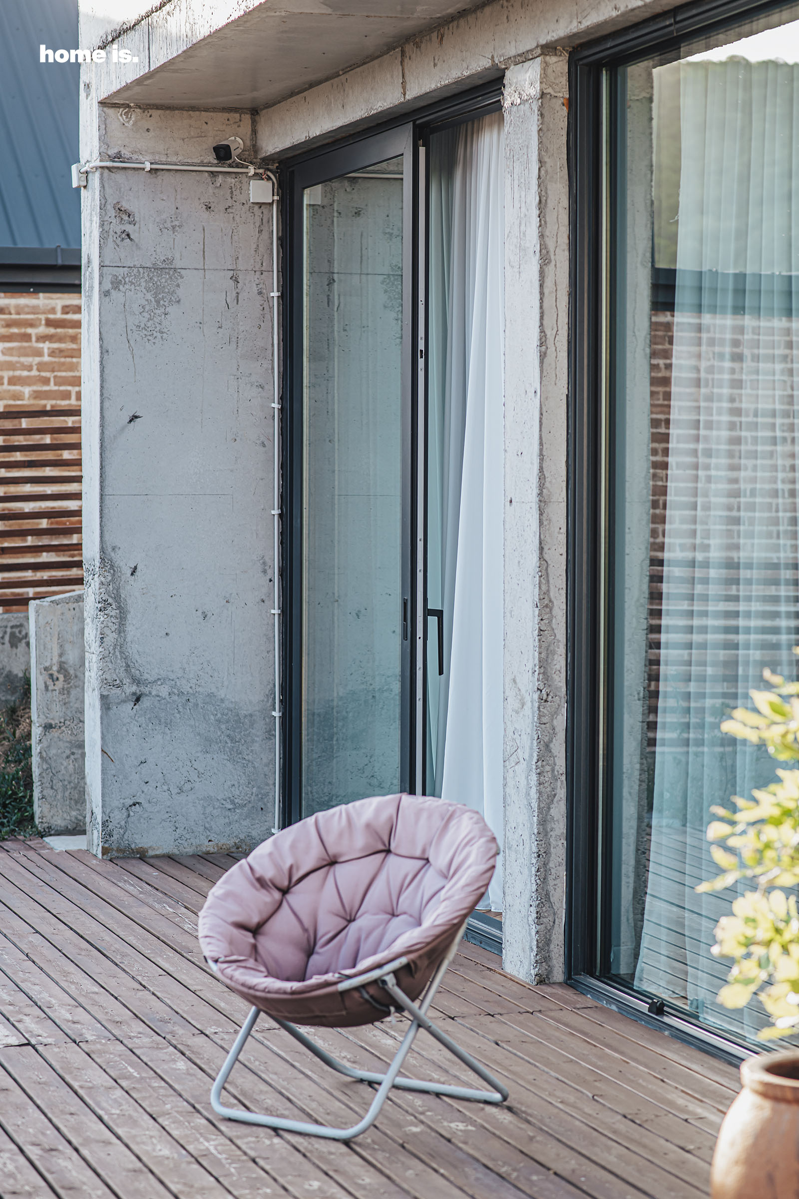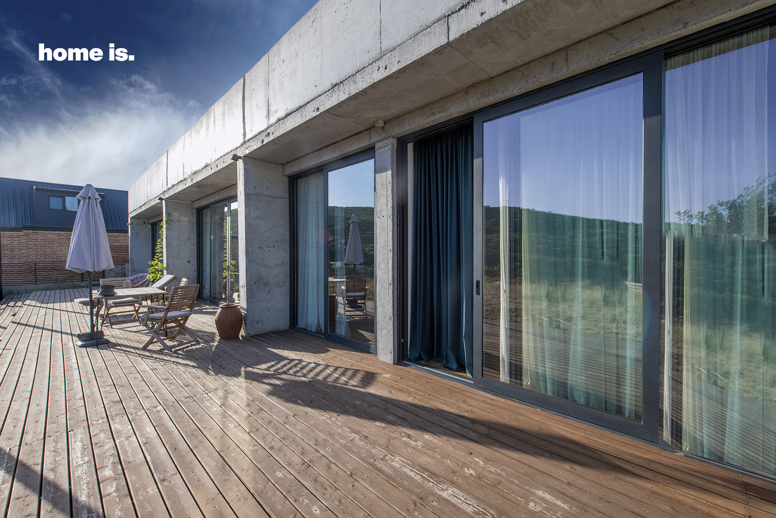 სახლის ყველა ოთახს აქვს გასასვლელი გადახურულ ტერასაზე, რომელზეც ალუმინის გასაგორებელი ვიტრაჟები გვხვდება. ტერასის ზედაპირზე გამოყენებულია ხის მასალა, რასაც გარემოში სითბოს ელემენტები შემოაქვს.