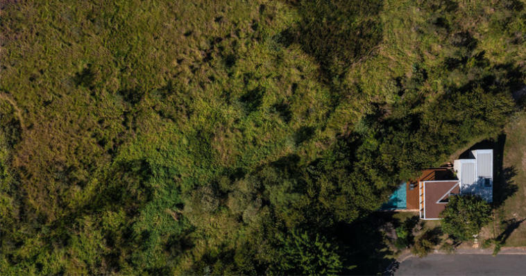 იმისათვის, რომ სახლი ირგვლივ არსებულ ფლორასთან და ფაუნასთან ყოველდღიური კონტაქტის ხელშეწყობის მიზნით, ხის მწვერვალების სიმაღლეზე განთავსებულიყო, შეიქმნა ქვის პოდიუმი, რომელიც ტექნიკურ ზონას იცავს და იტევს პატარა აუზს, რომლის ფორმაც ნაკვეთის კუთხეს ერგება. ამ გეომეტრიულ ტრაპეციულ ბლოკს (პოდიუმს) კი დიდი მეგალითური წარმონაქმნი ეყრდნობა.